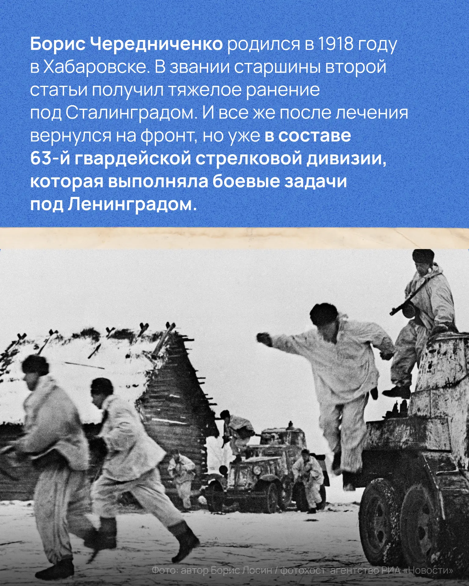 В карточках рассказываем про других героев-дальневосточников, уроженцев Хабаровска — Бориса Чередниченко и Виктора Тайнова. Их подвиг, совершенный за тысячи километров от родного дома, — наша общая, вечная память.