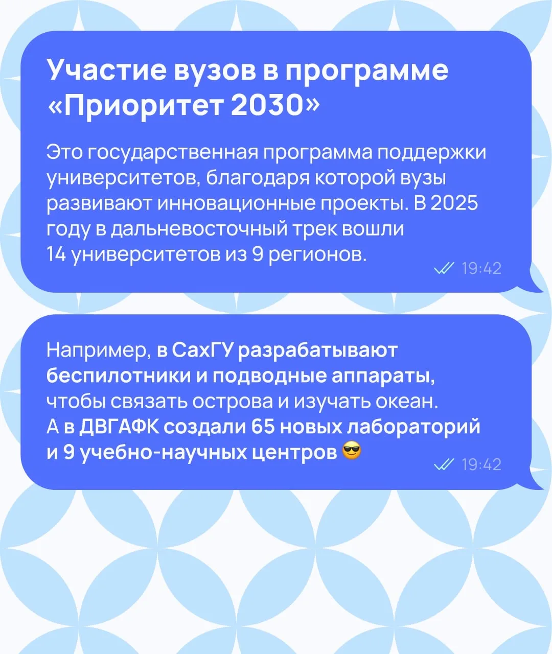 Подробнее об университетах и их уникальных направлениях читайте на нашем сайте. В прошлой публикации мы раскрыли пять причин выбрать дальневосточные вузы.