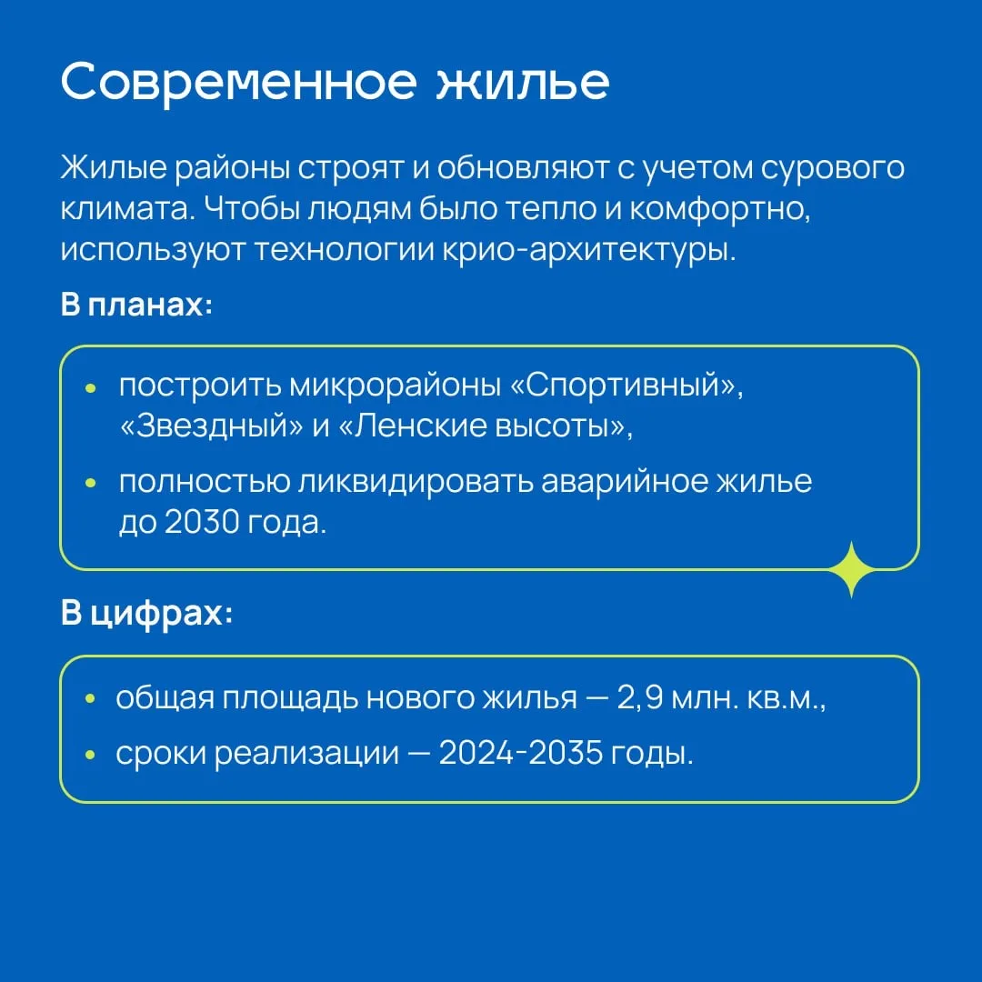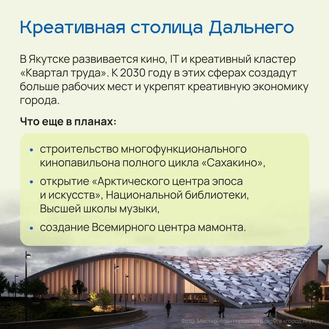 В карточках рассказываем, какие объекты уже строят, как обновляют инфраструктуру и почему Якутск становится центром креативных индустрий Дальнего.