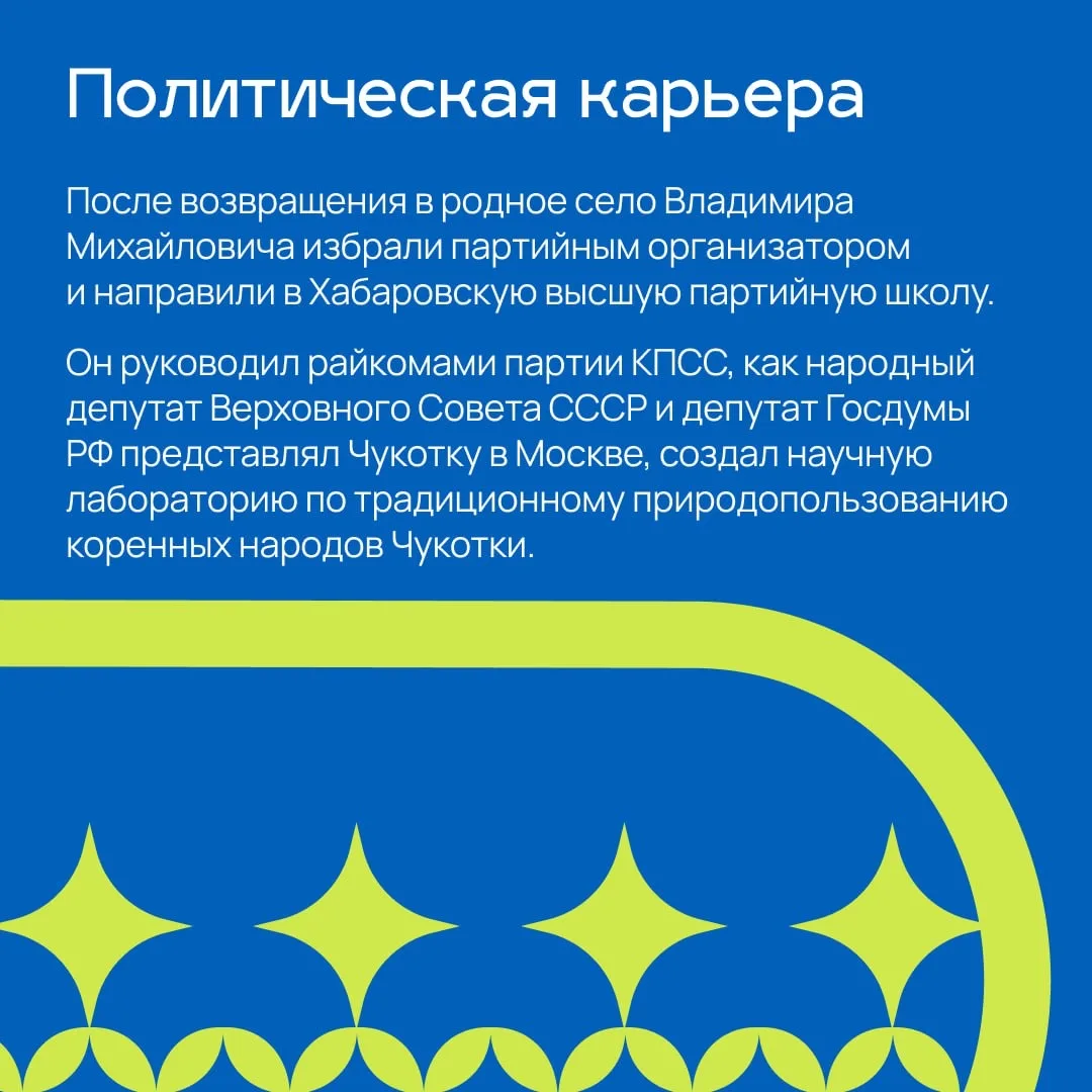 Он прошел большой путь от простого чукотского мальчишки до политика краевого и федерального уровней. Работал в Анадыре и Москве, а в 73 года вернулся в родное село. Здесь оформил «дальневосточные гектары» и основал кооператив «Орбат», где с единомышленниками восстанавливает сельское хозяйство и оленеводство.