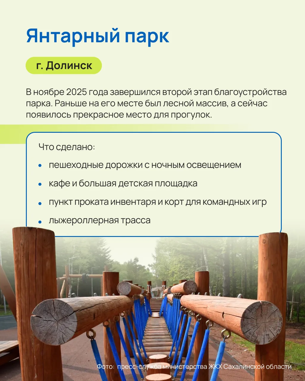 Например, в Долинске на месте лесного массива построили «Янтарный парк»: провели освещение, выложили дорожки, установили навесы, скамейки, открыли детские площадки и корт для командных игр. Теперь парк стал местом притяжения детей и взрослых.