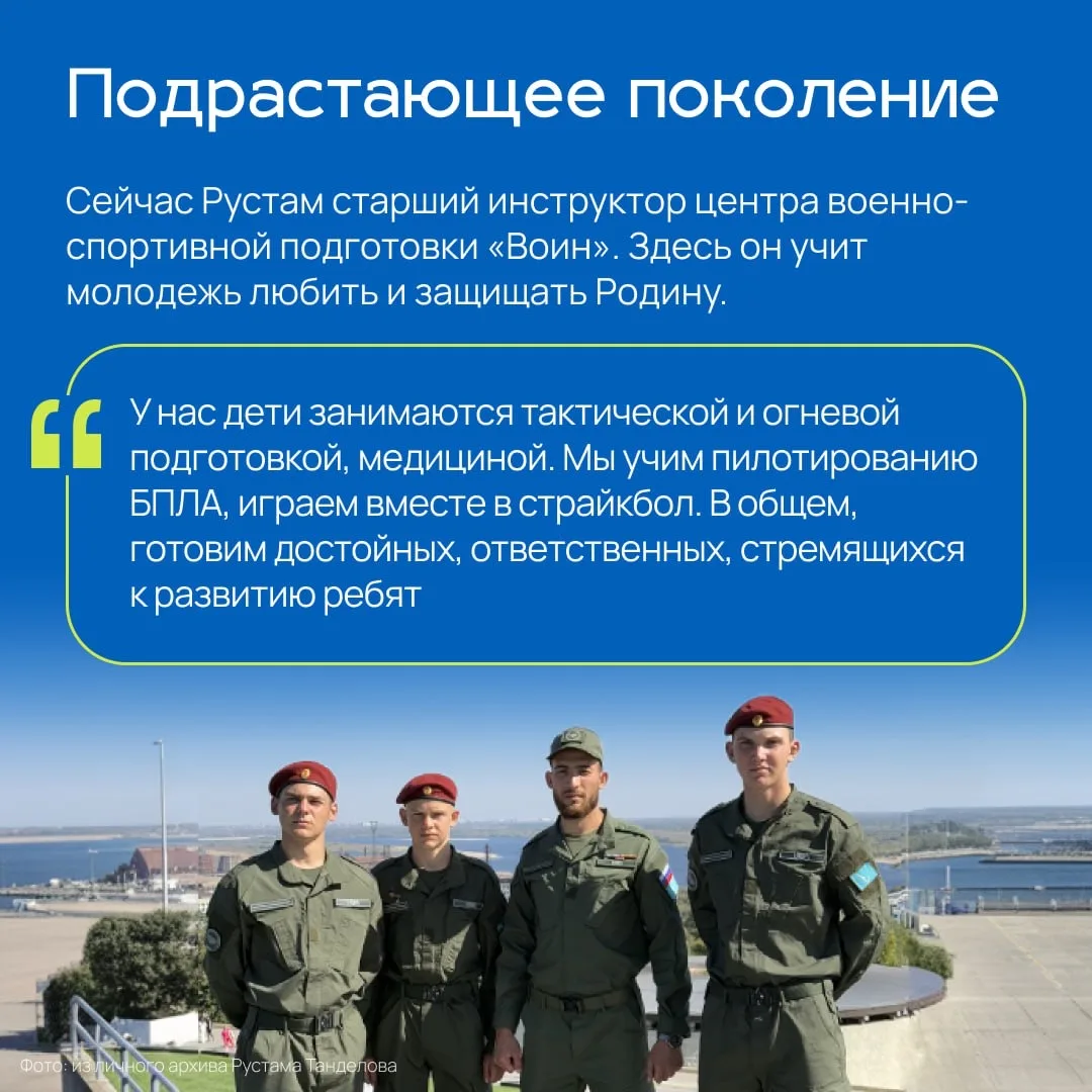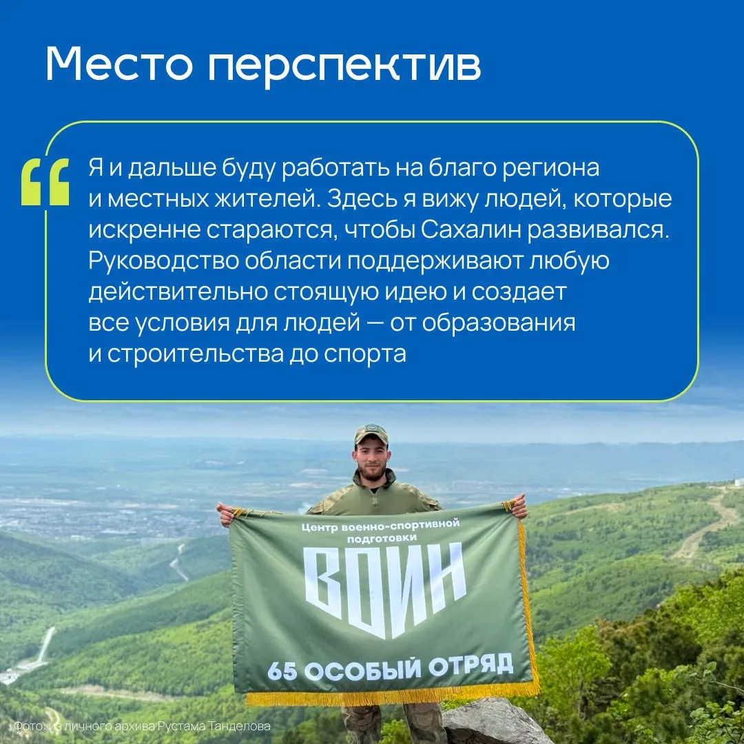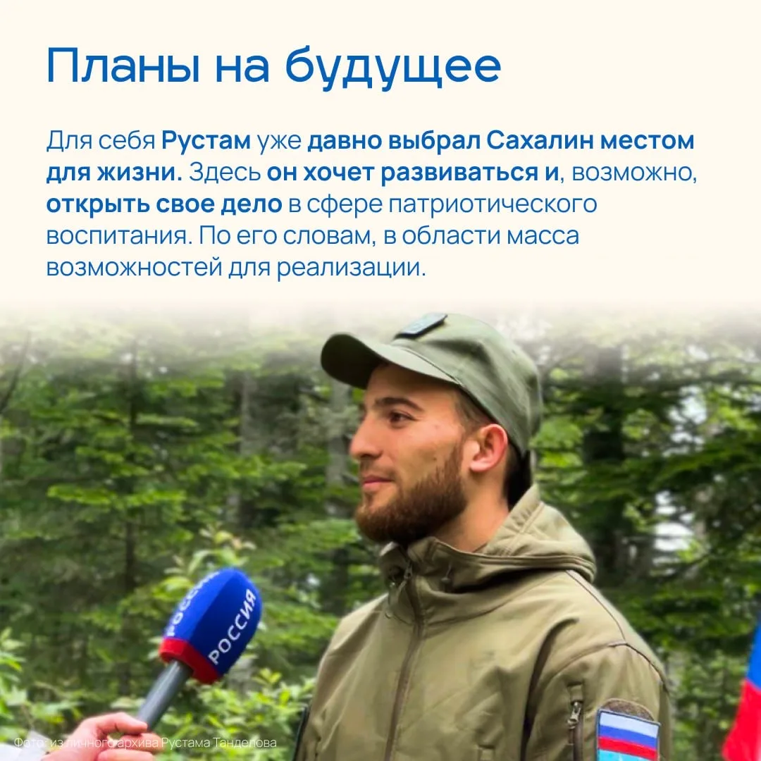 На спецоперации Рустам получил серьезное ранение. После длительного лечения карьеру военного пришлось оставить, но покидать полюбившийся Сахалин наш герой не захотел. Здесь ему предложили работу в центре «Воин» и теперь он воспитывает патриотизм у местных подростков.