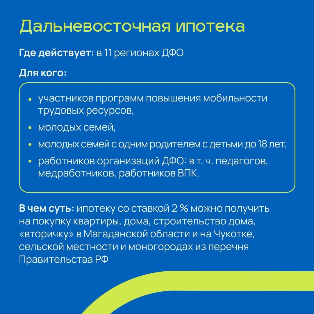 По «Дальневосточной ипотеке» здесь можно приобрести или построить жилье всего под 2% годовых. Программа распространяется и на «вторичку» — в Магаданской области, на Чукотке, в сельской местности и моногородах из перечня Правительства РФ.