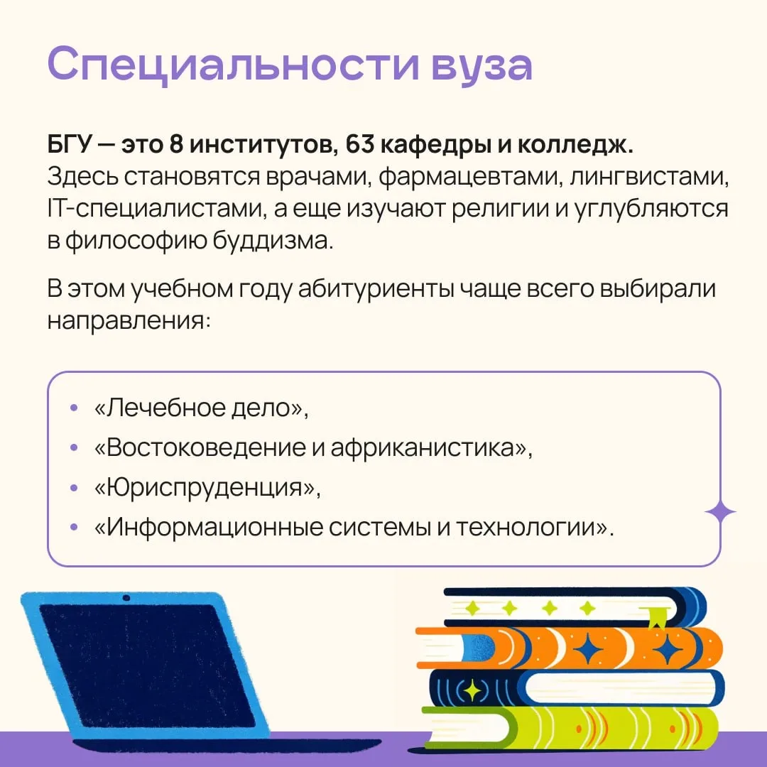 Знакомим с БГУ им. Доржи Банзарова — в карточках. Больше информации для поступающих вы найдете на нашем сайте.
