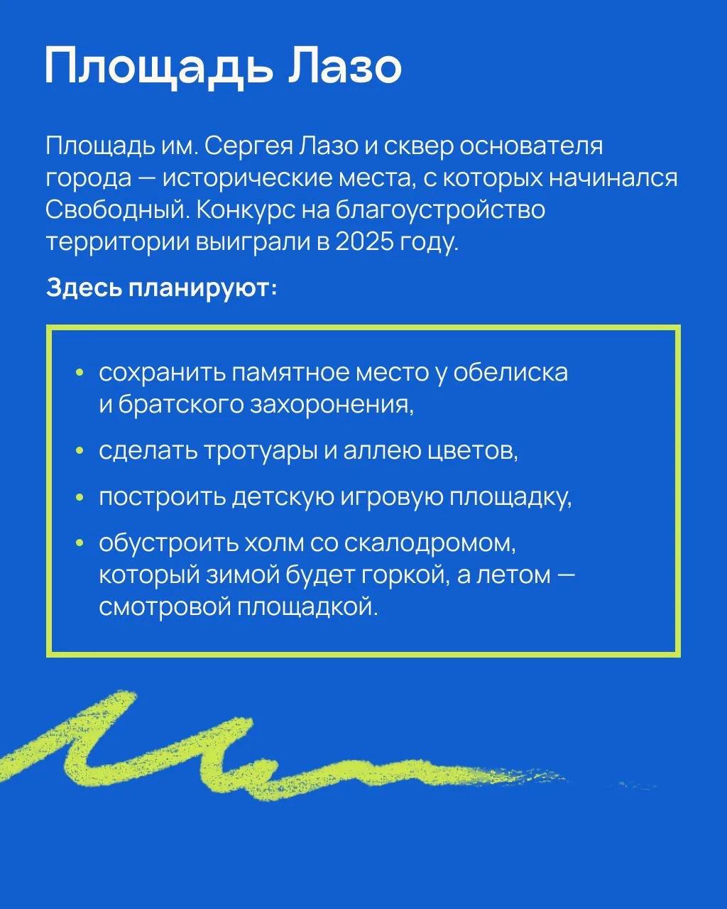 Свободный уже четыре раза побеждал в конкурсе лучших проектов по созданию комфортной городской среды. Последний — в 2025 году. Город получил грант 150 млн рублей на реконструкцию площади Сергея Лазо — исторического места, с которого и начался Свободный.