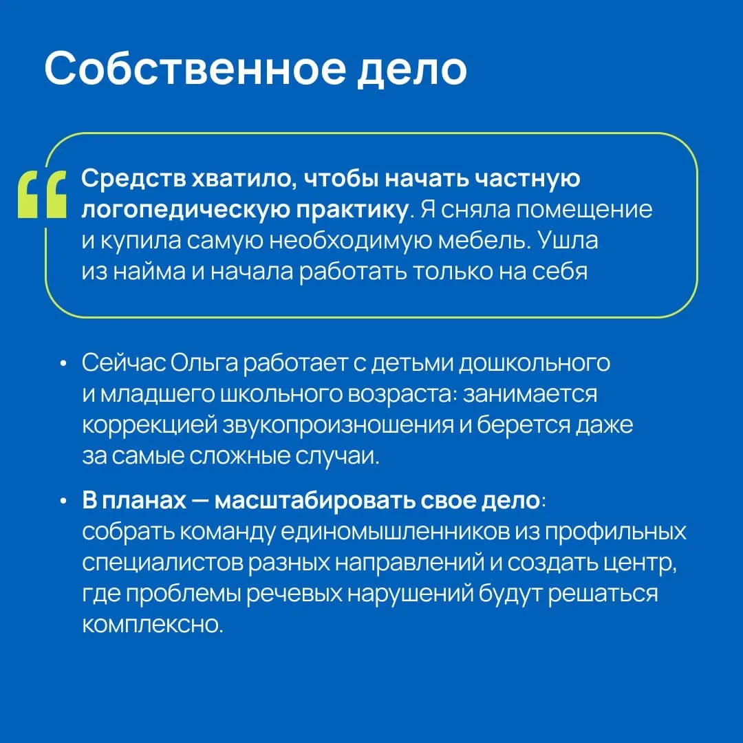С детства она знала, что хочет стать педагогом, помогать детям стать увереннее в себе и радоваться общению. Профессионализм, поддержка государства и личное упорство помогли ей открыть собственный логопедический кабинет и начать частную практику.
