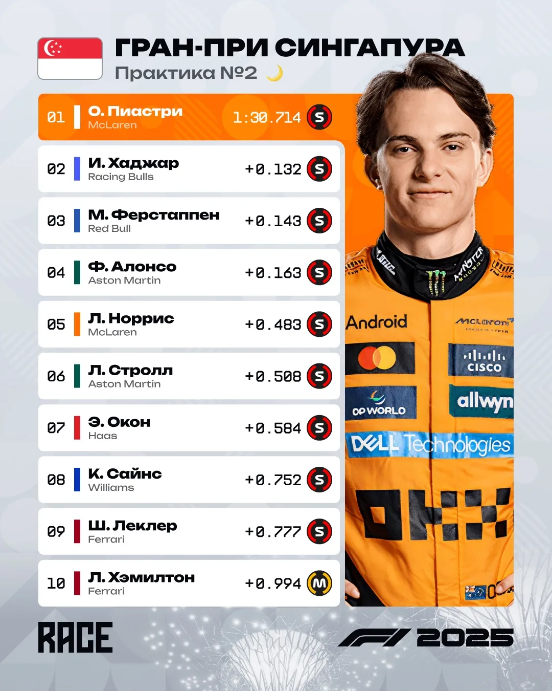 🇸🇬 Топ-10 по результатам второй сессии свободных заездов гран-при Сингапура.