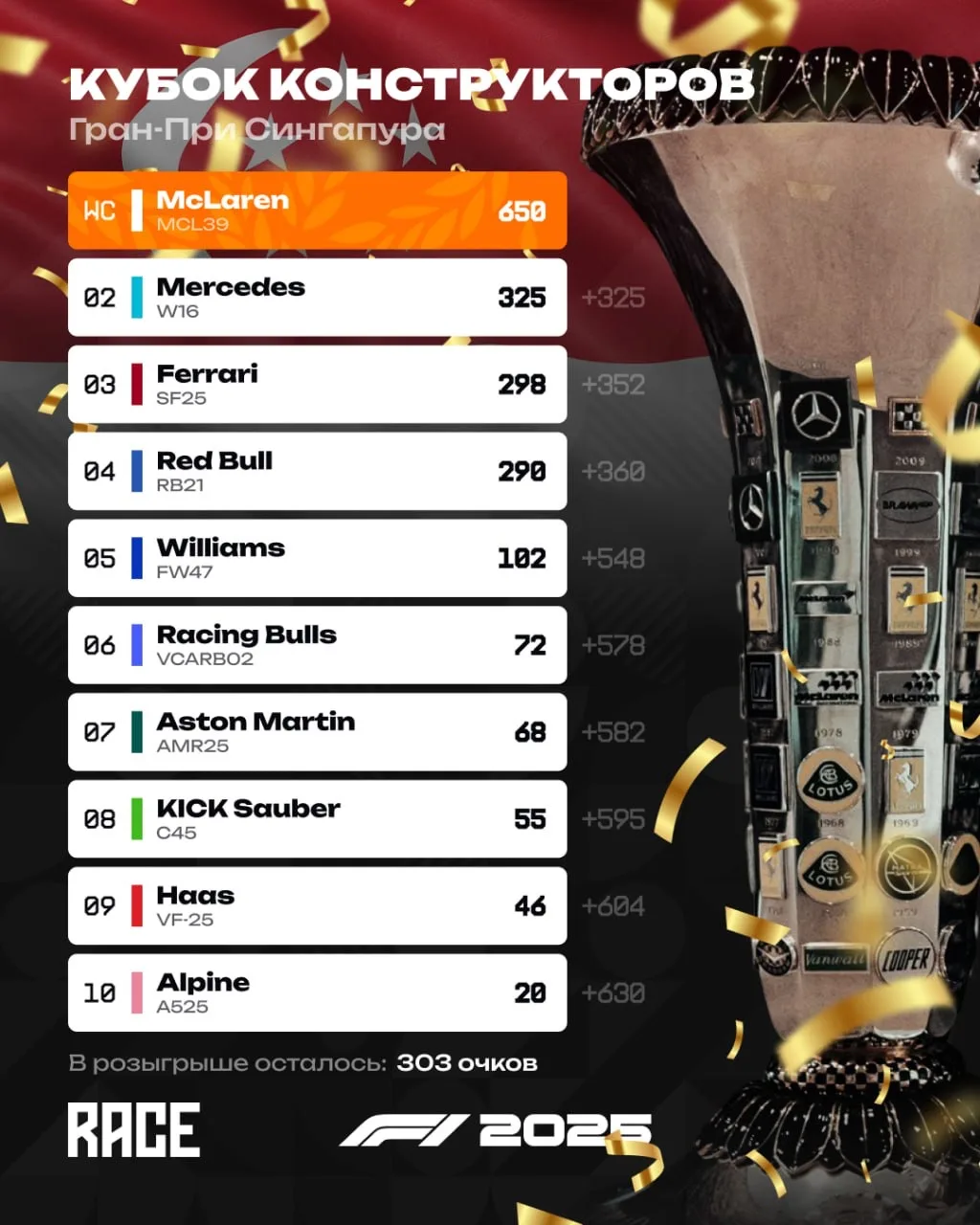 🇸🇬 Положение команд в Кубке конструкторов после гран-при Сингапура.