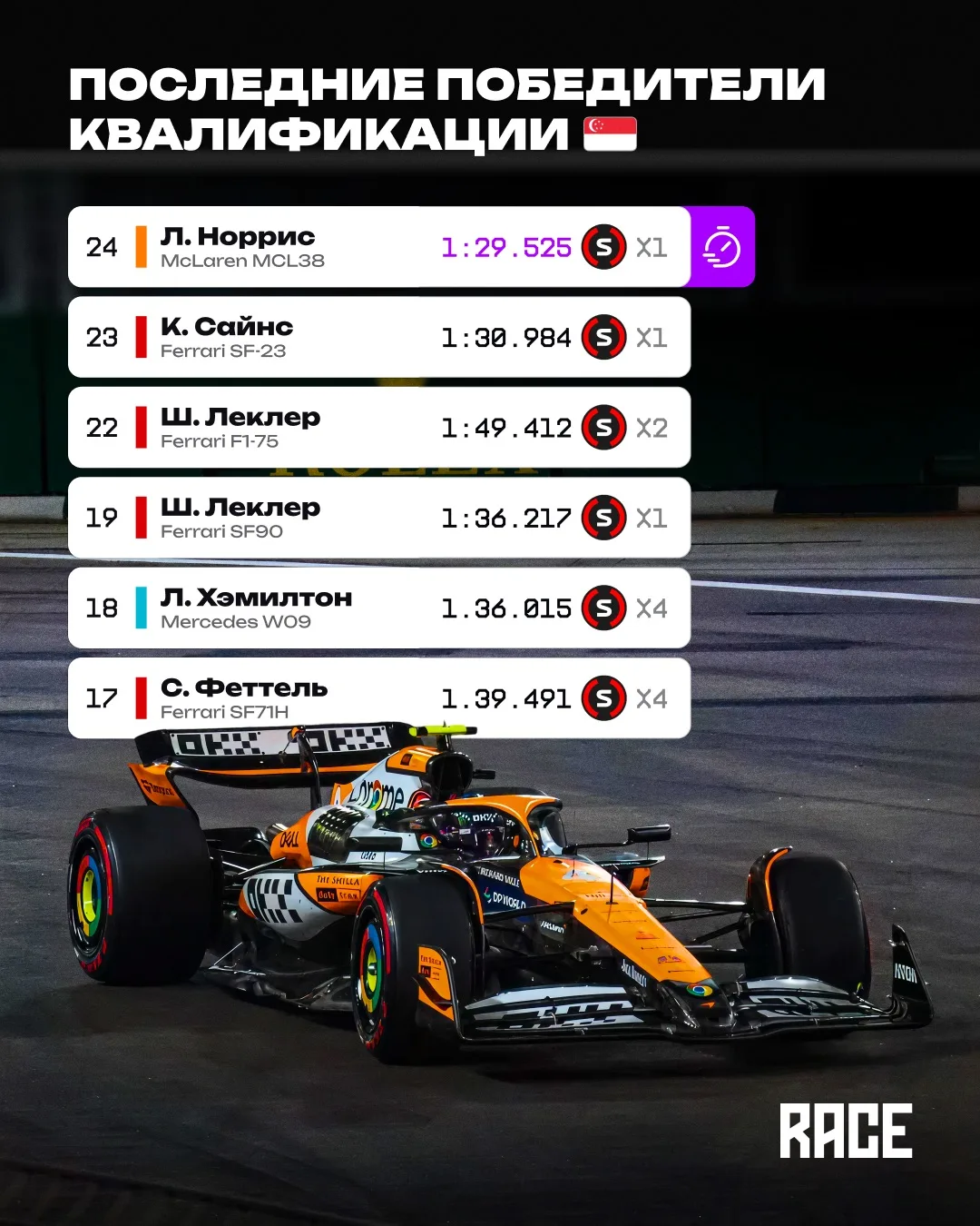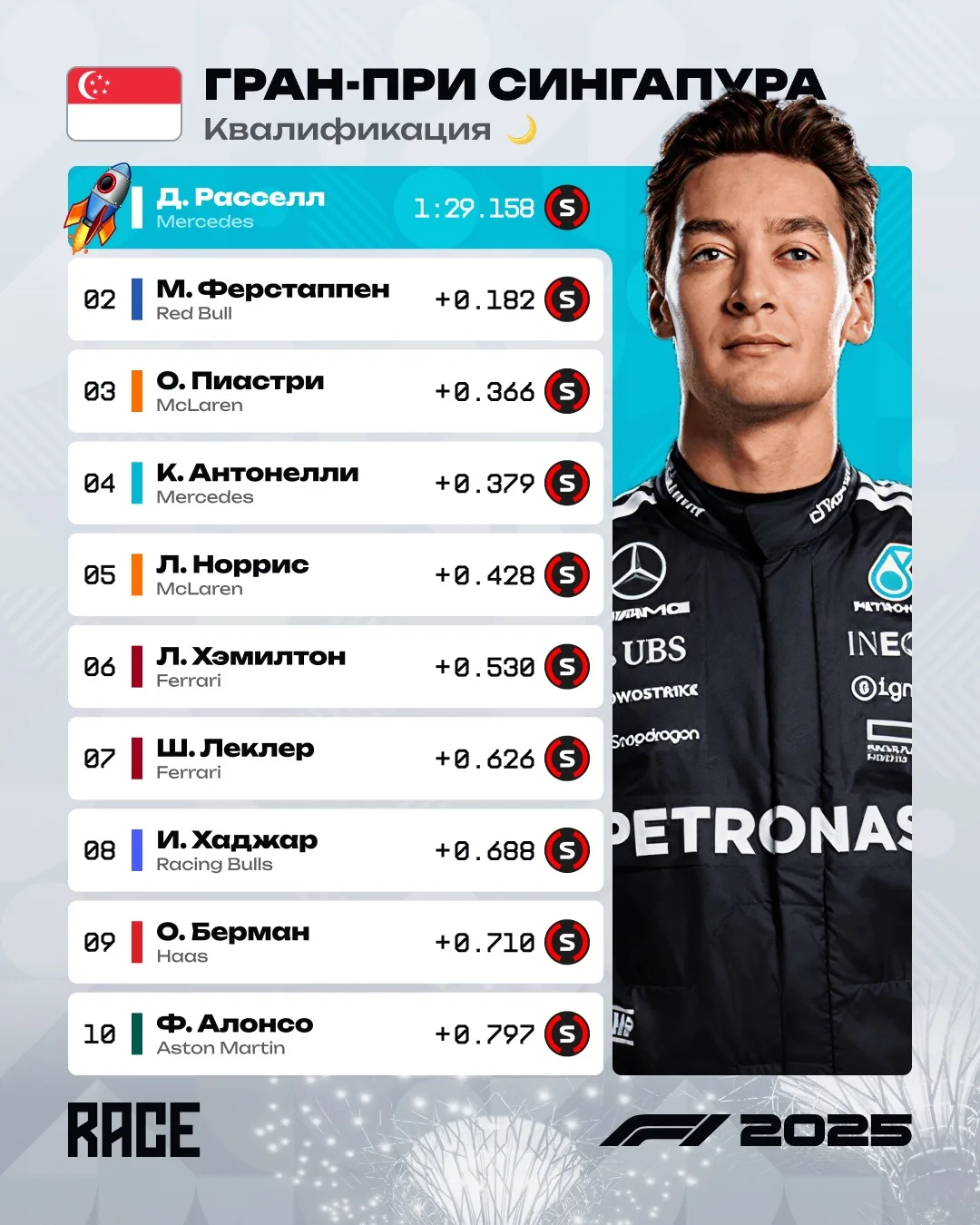 🇸🇬 Топ-10 по результатам квалификации гран-при Сингапура.