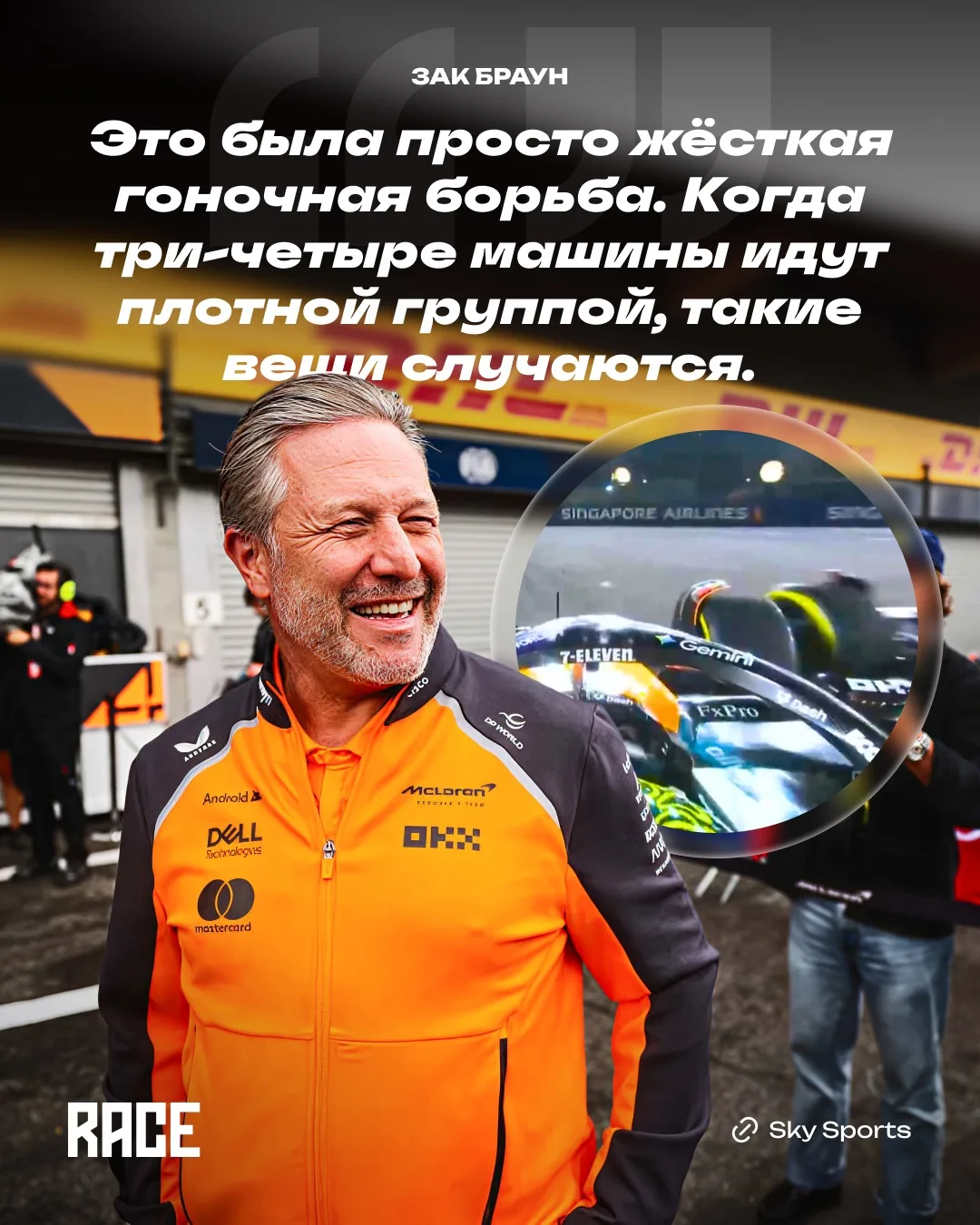 «Как и после любого гоночного уик-энда, мы пересмотрим все записи. Похоже, Макс и Ландо либо коснулись, либо одному из них пришлось притормозить — так что, очевидно, это был напряжённый момент в третьем повороте. Гонки есть гонки — просто жёсткая борьба.
