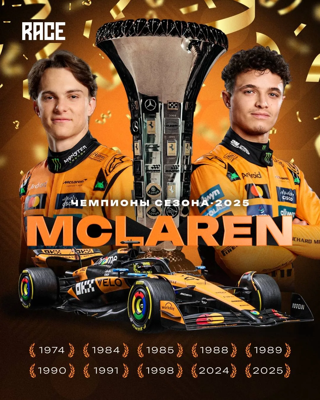 На гран-при Сингапура McLaren завоевали десятый Кубок конструкторов в своей истории и второй подряд — за шесть этапов до конца сезона-2025.