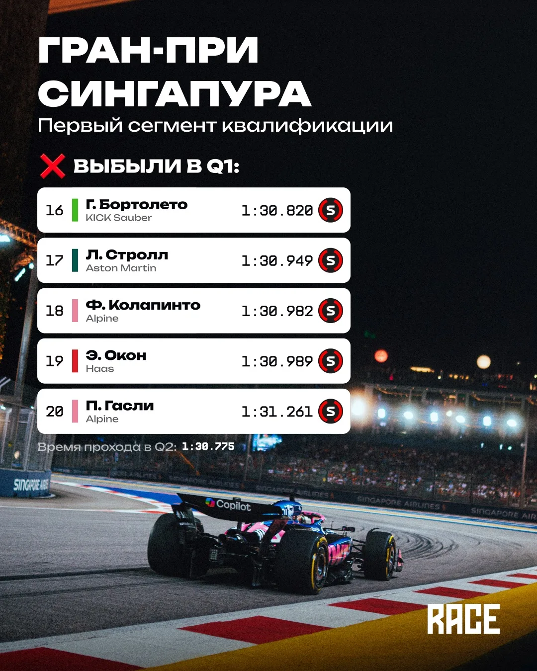 🇸🇬 Пятерка гонщиков, выбывших в первом сегменте квалификации гран-при Сингапура.
