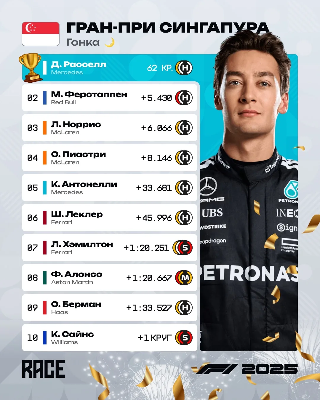 🇸🇬 Топ-10 на финише гран-при Сингапура.