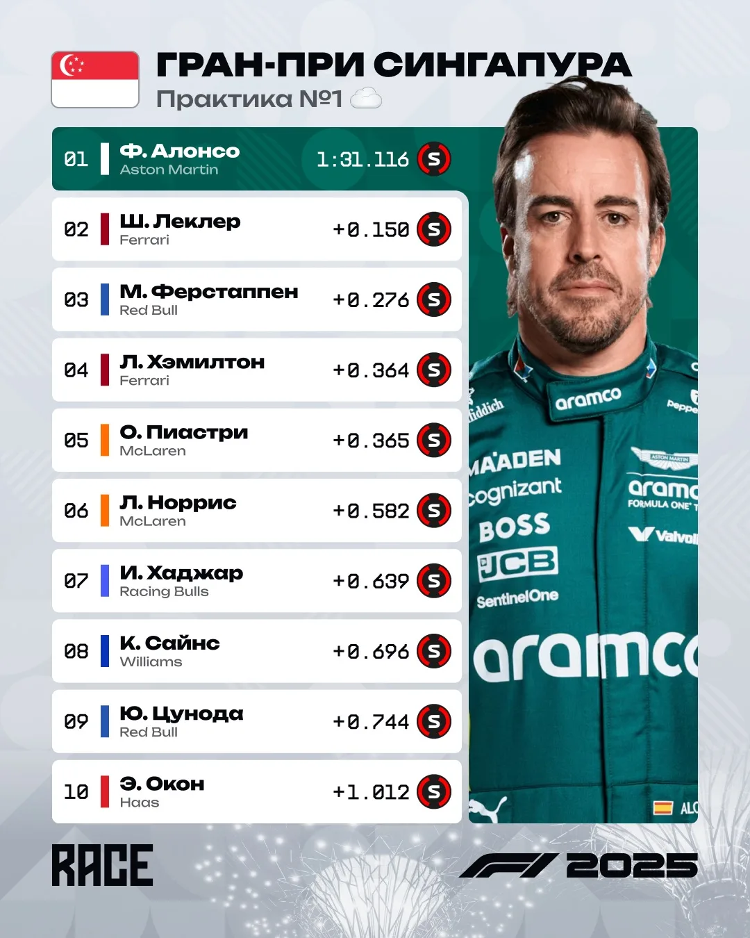 🇸🇬 Топ-10 по результатам первой сессии свободных заездов гран-при Сингапура.