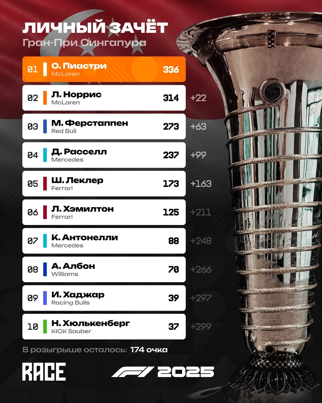 🇸🇬 Положение гонщиков в личном зачёте после гран-при Сингапура.