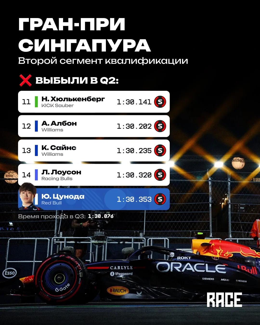 🇸🇬 Юки Цунода выбывает во втором сегменте квалификации гран-при Сингапура.