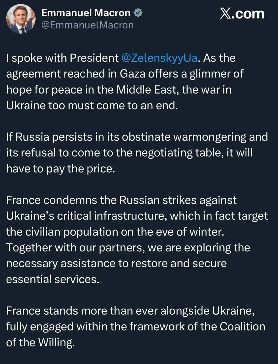 По его словам французского президента, достигнутое ранее мирное соглашение по конфликту в секторе Газа вселяет надежду на мир на Ближнем Востоке, поэтому и украинскому кризису тоже должен быть положен конец.