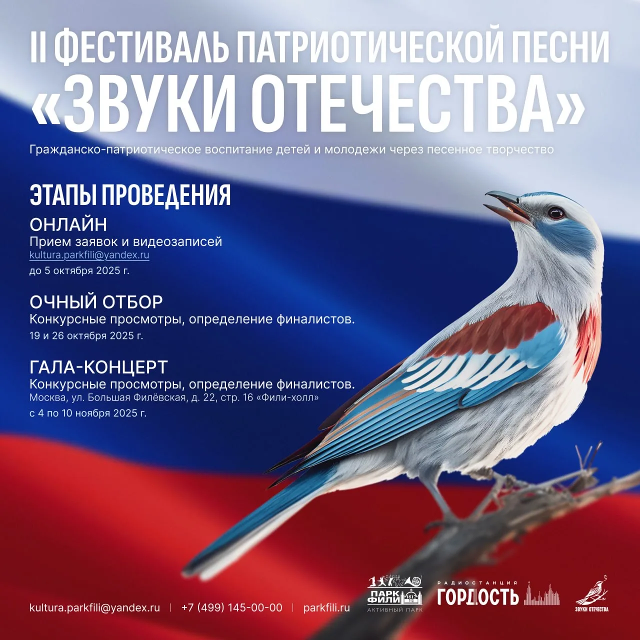 Проводит его парк «Фили». Он соберет под своим крылом исполнителей патриотических песен разных возрастных категорий — от 5 до 35лет.