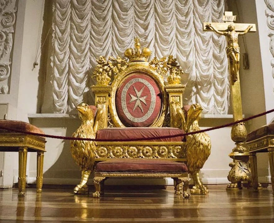 Один из посетителей проигнорировал правила и залез на трон магистра Мальтийского ордена, положив ноги на подножную скамью из золочёного бархата на орлиных лапах.