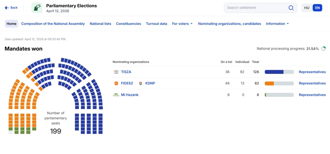 Партия Орбана существенно проигрывает оппозиции по результатам обработки 21,5% бюллетеней в Венгрии.