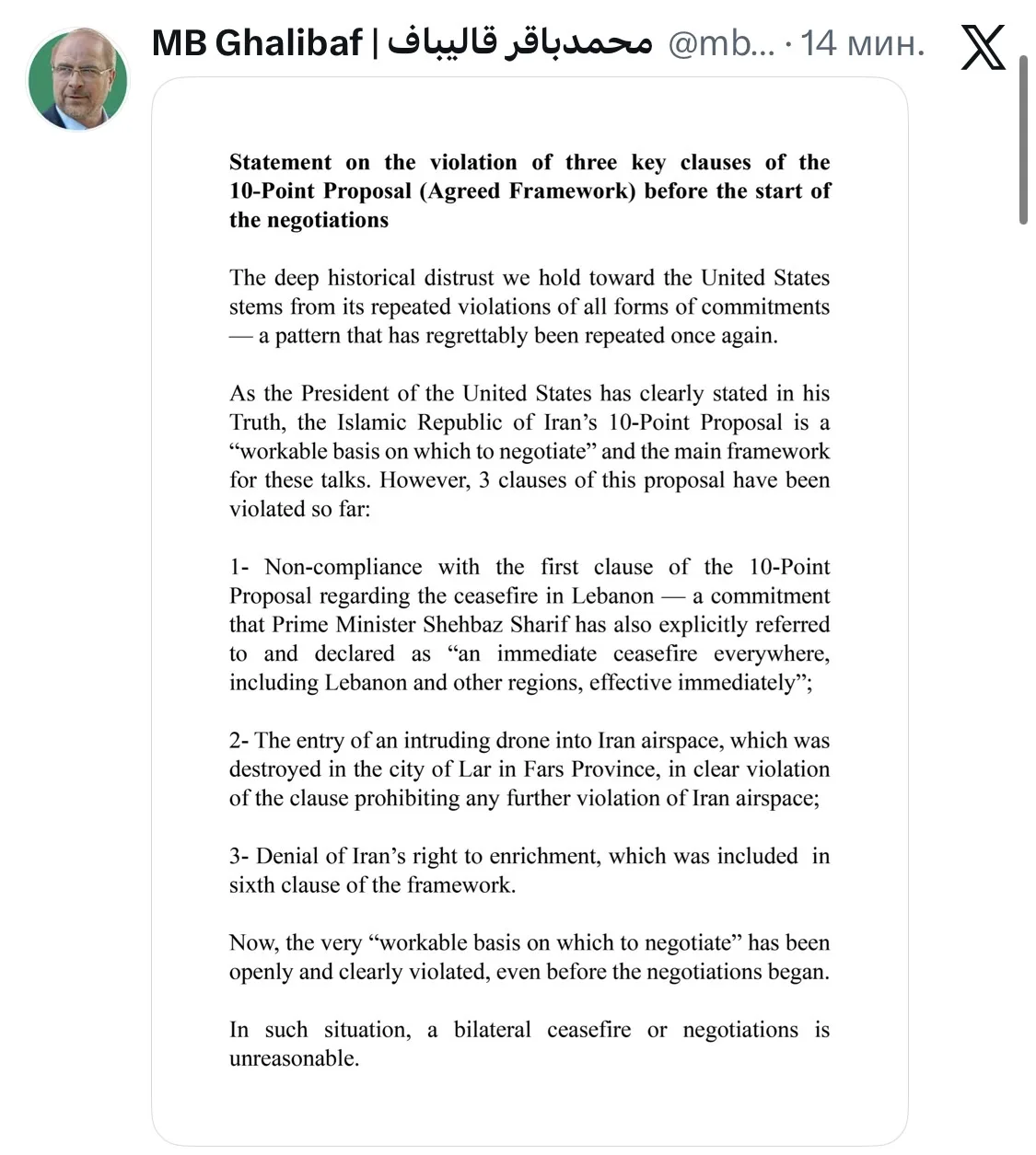 США уже нарушили 3 из 10 пунктов потенциального мирного соглашения, в таких условиях нет смысла ни в прекращении огня, ни в продолжении переговоров. Об этом заявил спикер иранского парламента Галибаф, которого западные СМИ называют переговорщиком от Ирана.