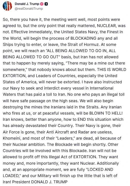 Трамп: мы уничтожили весь флот Ирана, 158 кораблей лежат на дне, но если ОСТАВШИЕСЯ корабли приблизятся к нашей блокаде, мы потопим и их.