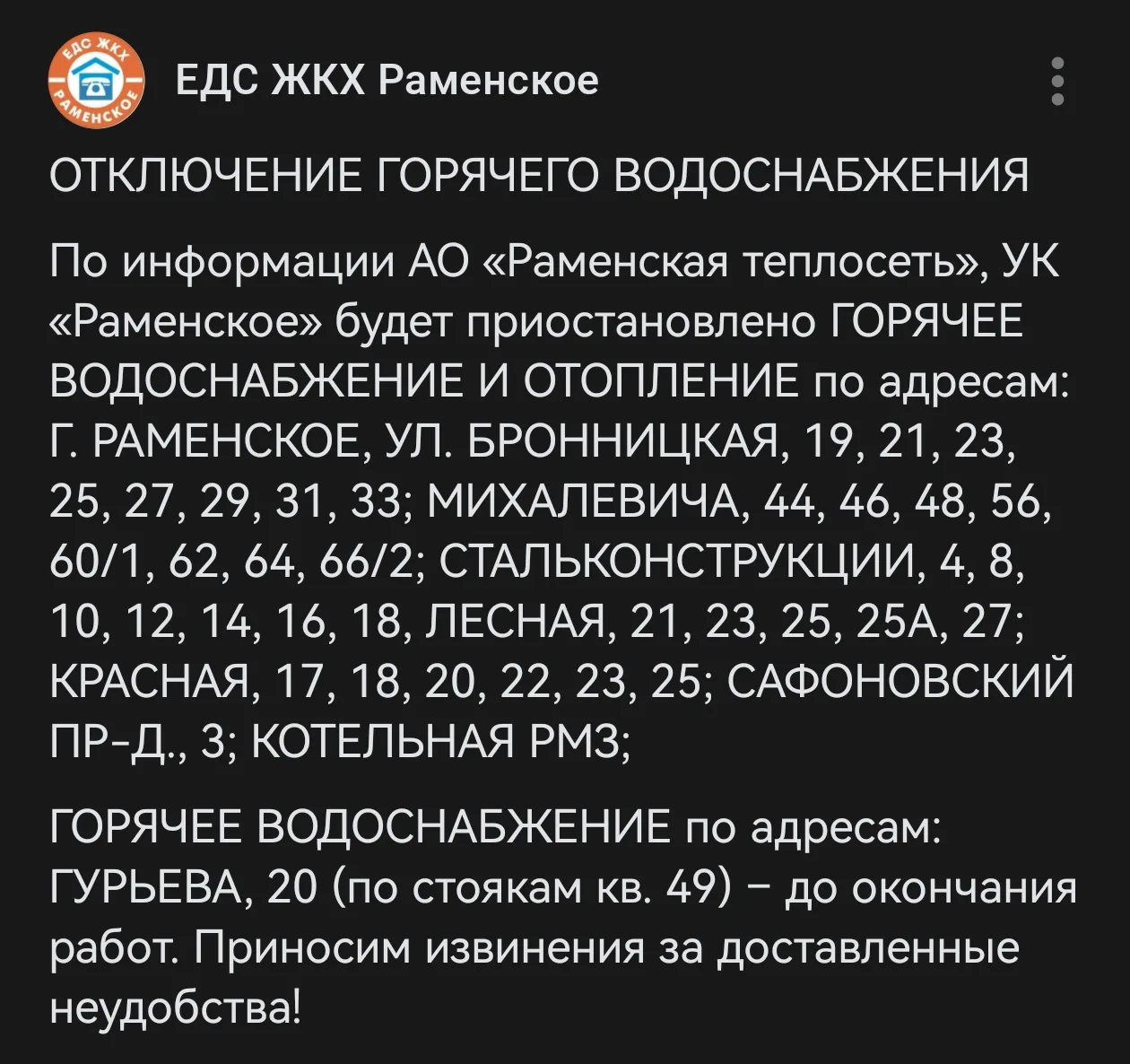 Авария на теплосетях АО «Раменская теплосеть», УК «Раменское» приостановлено ГОРЯЧЕЕ ВОДОСНАБЖЕНИЕ И ОТОПЛЕНИЕ