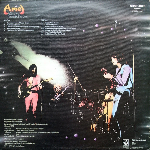 Из пепла двух важнейших австралийских рок-групп — сиднейской Tamam Shud и легендарной Spectrum из Мельбурна — выросла Ariel , эклектичная арт-поп-группа, созданная гитаристом/вокалистом Майком Раддом [родившимся в Новой Зеландии] и басистом Биллом Путтом. После распада Spectrum, в 1973 году авторы песен Радд и Путт сформировали новую группу, в состав которой вошли Найджел Макара (ударные), Джон Миллс (клавишные) и Тим Гейз (вокал, гитара). Они заручились поддержкой прогрессивного лейбла EMI Harvest, выпустив в ноябре 1973 года дебютный альбом «A Strange Fantastic Dream», вероятно, свой самый цельный прогрессив-рок-альбом со сложными аранжировками и энергичными выступлениями. Несмотря на спорную обложку с оттенком наркотиков, альбом достиг 12-го места в австралийских чартах LP в 1974 году.