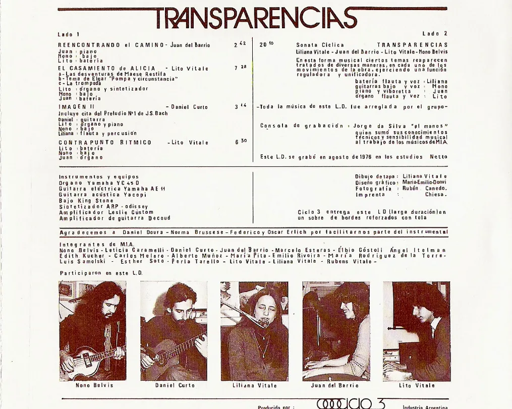 Знакомьтесь, представители Аргентины M.I.A. Не просто ансамбль, но нечто большее. Под заглавной аббревиатурой, означающей Mъsicos Independientes Asociados, скрывалось основанное в середине 1970-х содружество творческих лиц, объединявшее собственно музыкантов, художников и технарствующих изобретателей. Центром могучей кучки являлись брат с сестрой по фамилии Витале, Лито (ударные, флейта, синтезаторы, клавишные, вокал) и Лилиана (флейта, перкуссия, ударные, вокал). С их подачи и была записана дебютная пластинка "Transparencias". Помогали ребятам басист Ноно Белвис, гитарист Даниэль Курто, а также органист (по совместительству ударник) Хуан Дель Баррио. Этим релизом молодые аргентинские гении продемонстрировали, что могут сочинять и исполнять арт-рок в лучших традициях жанра, не слабее, чем англичане или же голландцы.