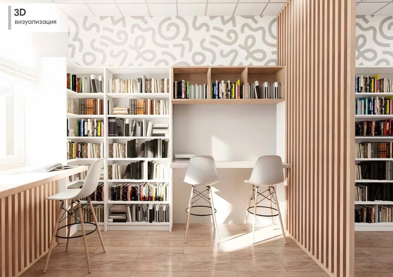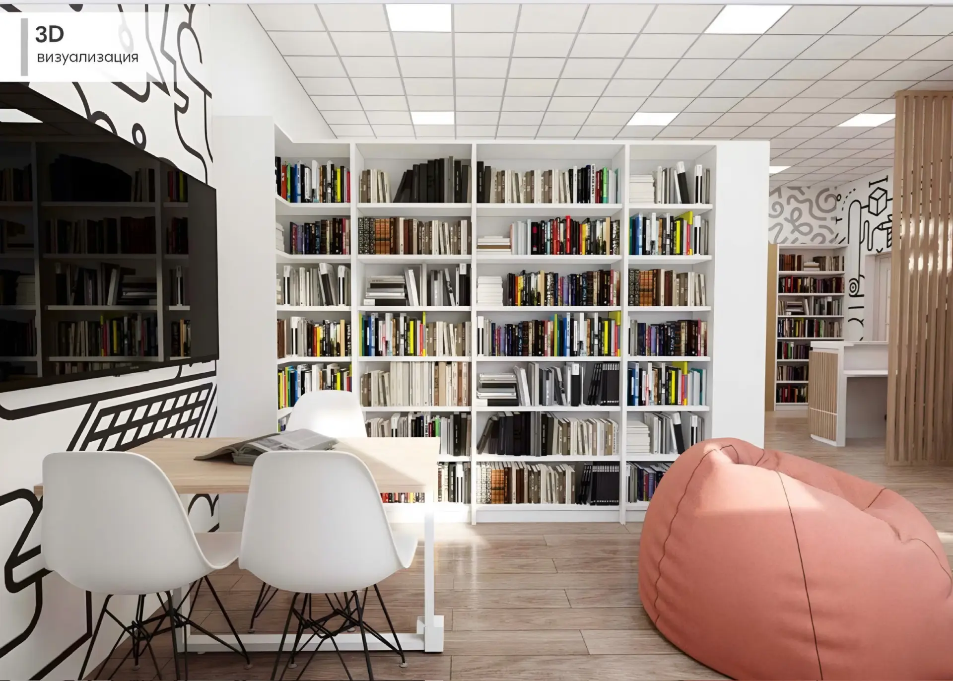 Ha фотографиях - визуализация будущей модельной библиотеки в селе Ильичевское, которая стала победителем конкурса и будет модернизирована в этом году в рамках нацпроекта «Семья».