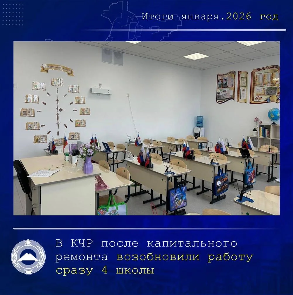 После масштабного капитального ремонта в республике возобновили работу сразу 4 образовательных учреждения: гимназия №5 в Черкесске, СОШ №2 им. М.М. Узденова в селе Учкекен, СОШ №6 им. А.А. Тамбиева в селе Первомайское, СОШ посёлка Кавказский им. Д. А. Старикова.