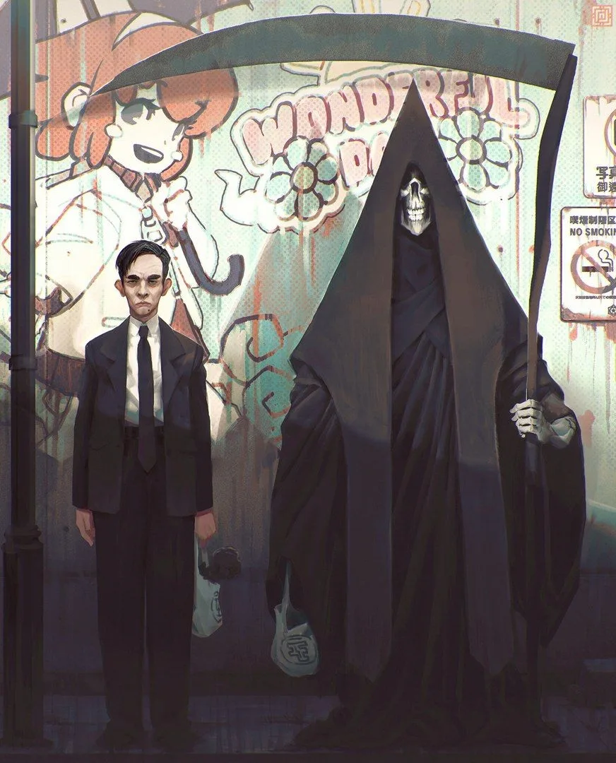 Смерть оказывается за спиной парочки и шепчет на ухо мужчине: