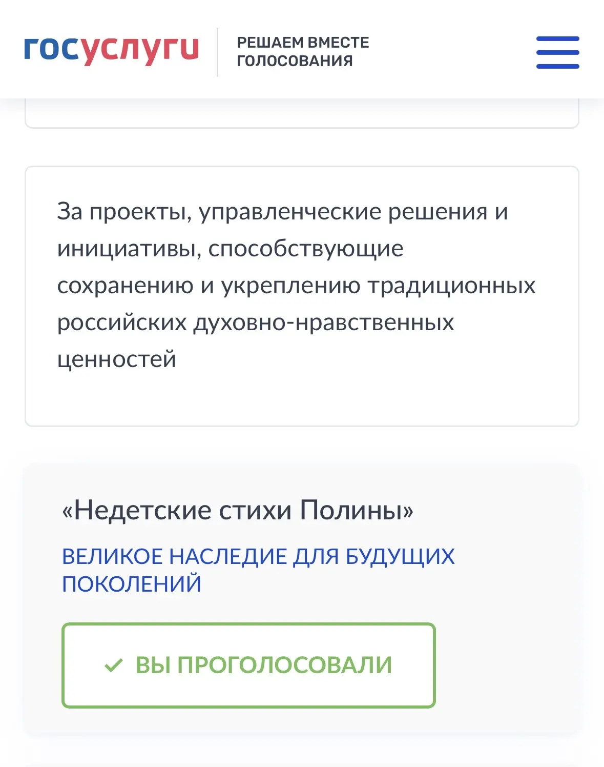 - найти проект «Недетские стихи Полины» (он первый в списке) и нажать «Голосовать».