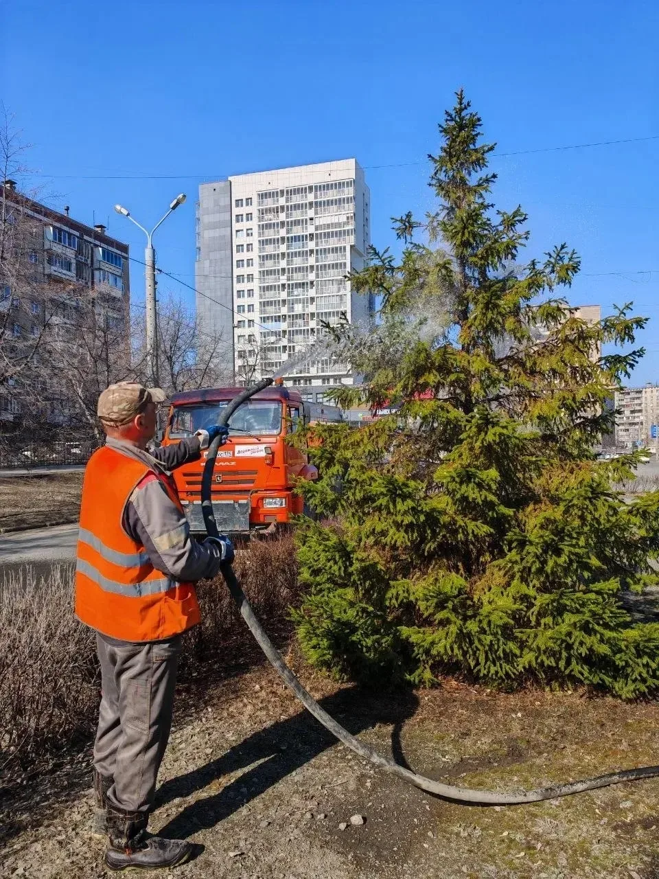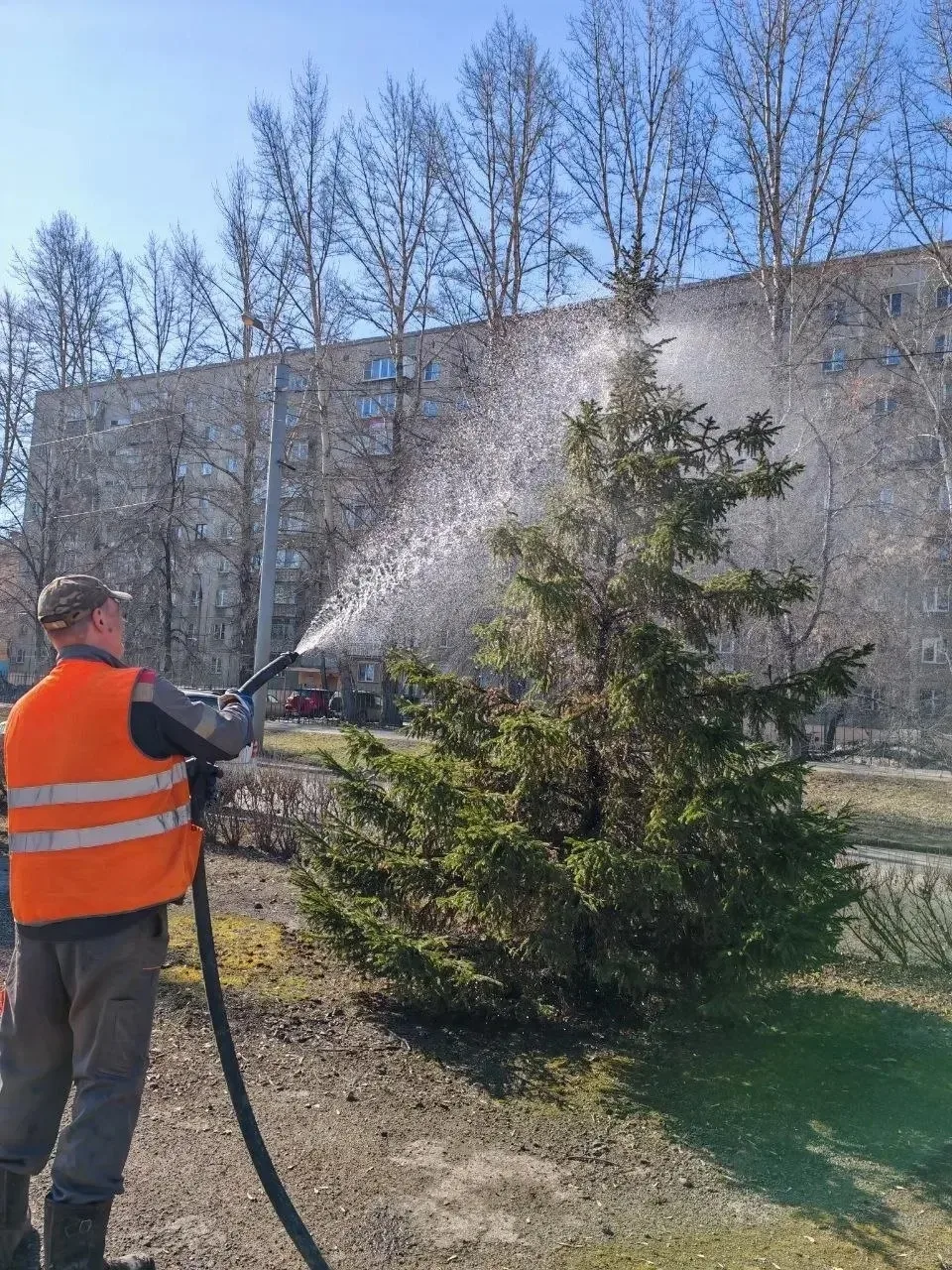 🚿 МКУ «ЭВИС» приступило к ежегодной процедуре — мойке елей вдоль автомобильных дорог.