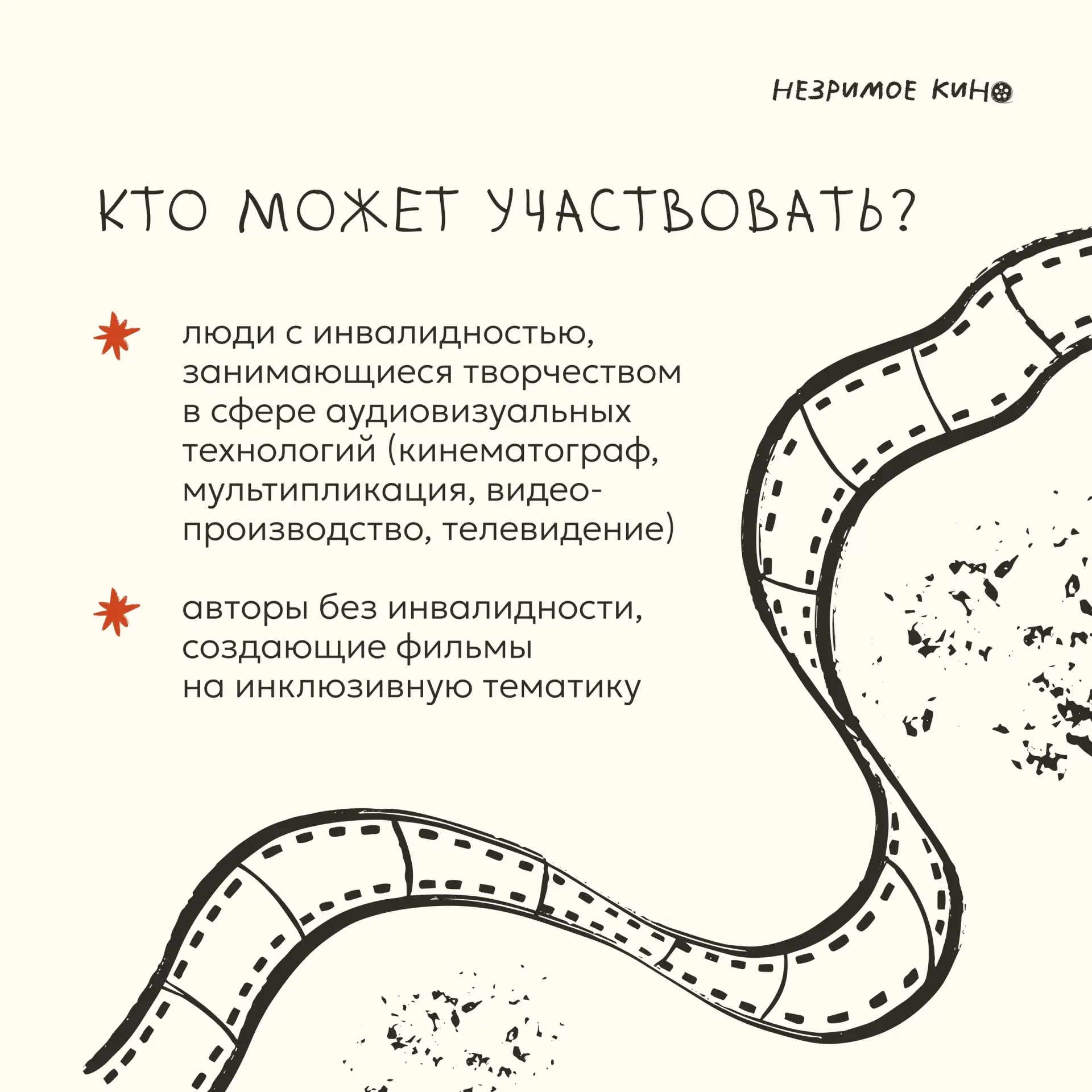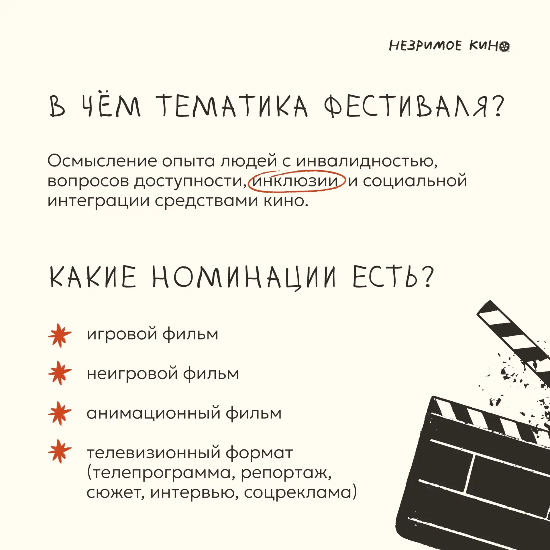 ♿ Главная тема — осмысление жизни людей с ОВЗ, вопросы доступности, инклюзии и социальной интеграции. Организаторы ждут добрые, жизнеутверждающие фильмы, которые помогают иначе взглянуть на «другого» в современном мире.