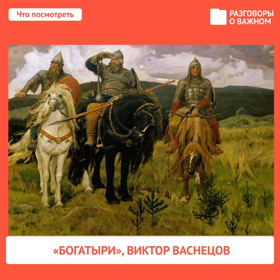 Не забудем и о былинных героях — впору еще раз внимательно рассмотреть шедевр российской живописи. Ведь персонажи на полотне — вовсе не вымышленные. Илья Муромец, Добрыня Никитич и Алёша Попович — настоящее воплощение силы и мудрости. Кстати, на одном из занятий мы недавно обсуждали это произведение. А помните ли вы, в каком музее можно его увидеть?
