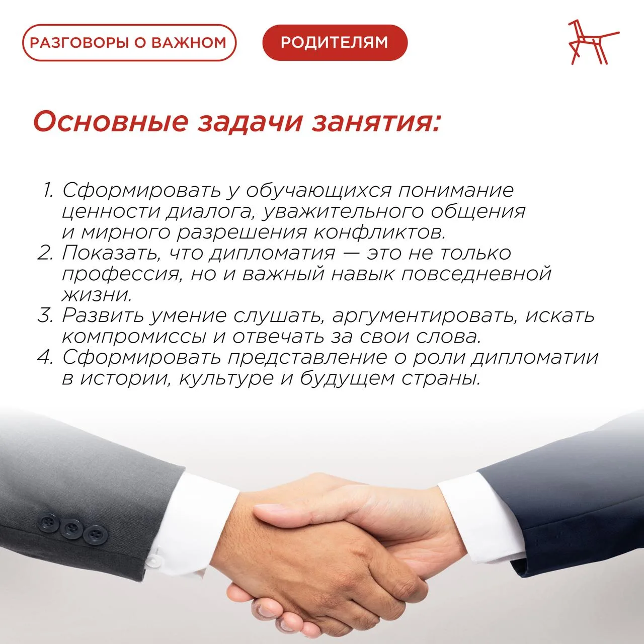 На примере истории ребят, которые учатся слушать и договариваться, ролик показывает суть дипломатии. Он помогает детям понять, что прочные договорённости строятся на уважении и умении слышать другого.
