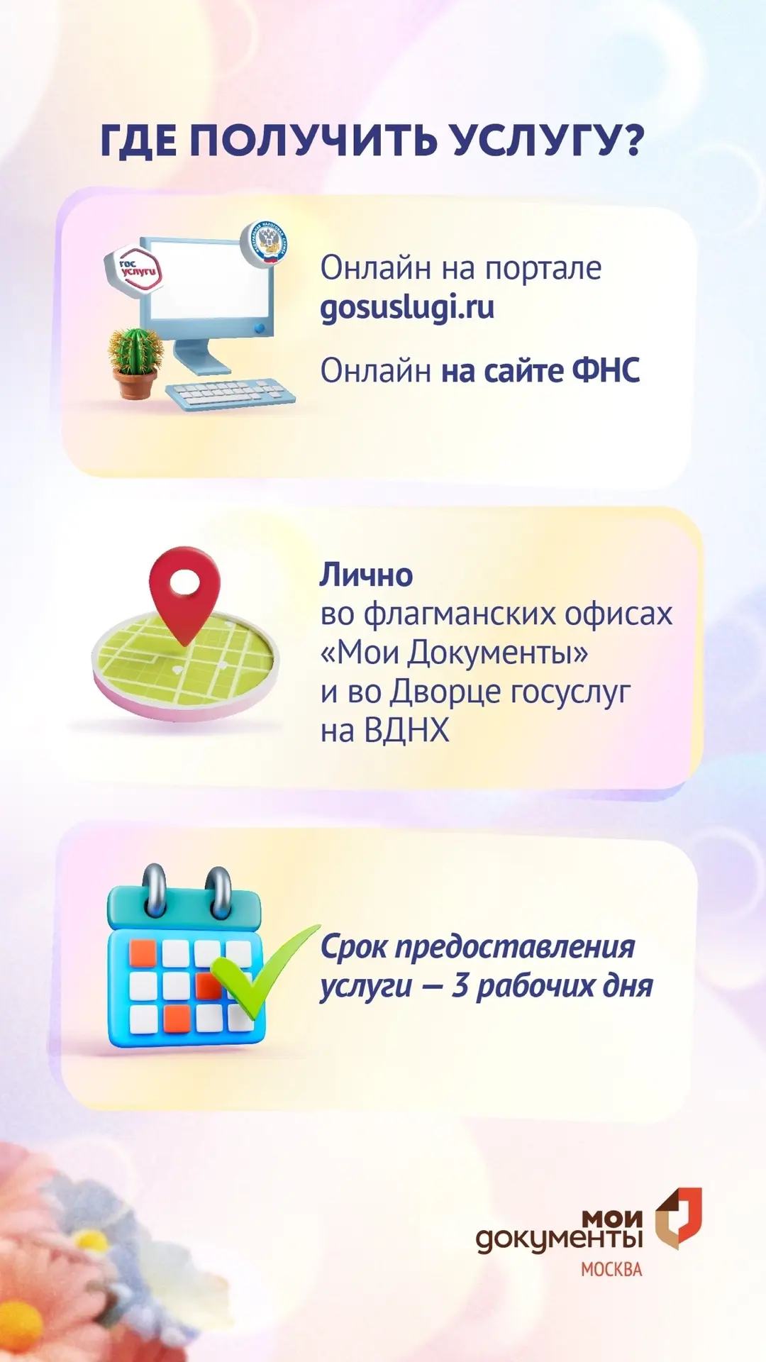 ☑️ Во всех флагманских офисах «Мои Документы» или во Дворце госуслуг на ВДНХ. ☑️ Онлайн на сайте ФНС.