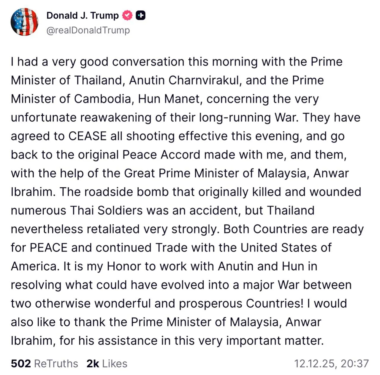 «Сегодня утром у меня состоялся очень хороший разговор с премьер-министром Таиланда Анутином Чарнвиракулом и премьер-министром Камбоджи Хун Манетом по поводу очень печального возобновления их давнего конфликта. Они согласились прекратить все боевые действия с сегодняшнего вечера и вернуться к первоначальному мирному соглашению, заключенному со мной и с ними при содействии великого премьер-министра Малайзии Анвара Ибрагима».