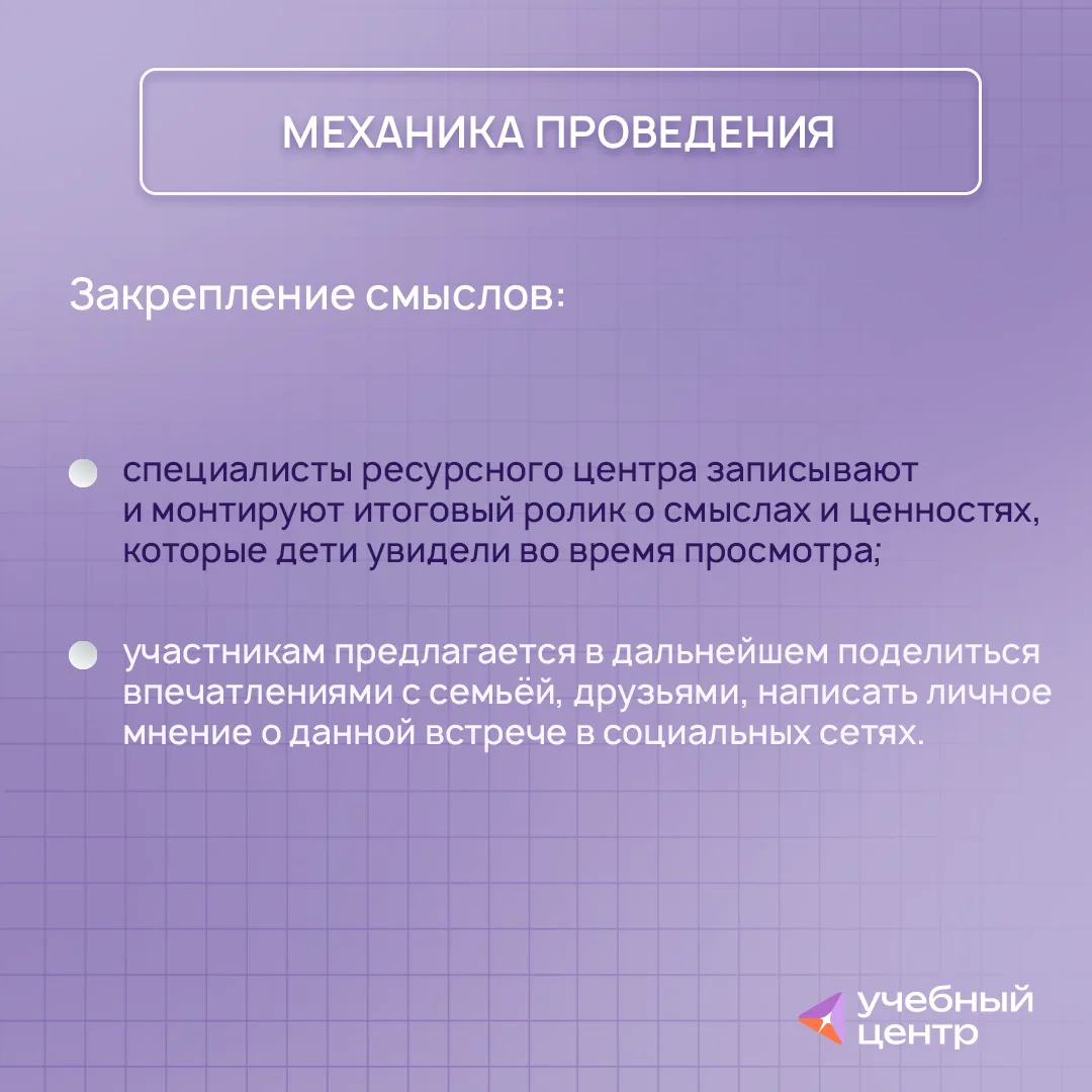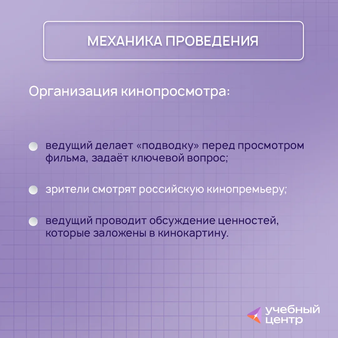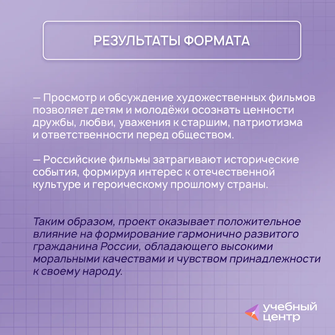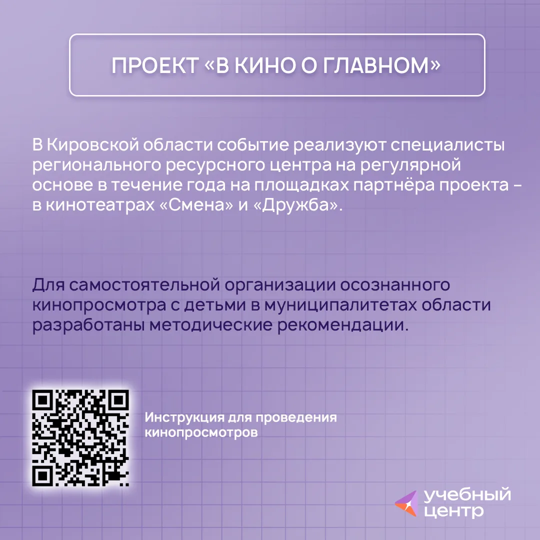 🧡 Проект команды «Навигаторов детства» Кировской области «В кино о Главном» представляет собой совместные кинопросмотры с обучающимися школы и СПО отечественных фильмов, направленных на формирование духовно-нравственных ценностей.