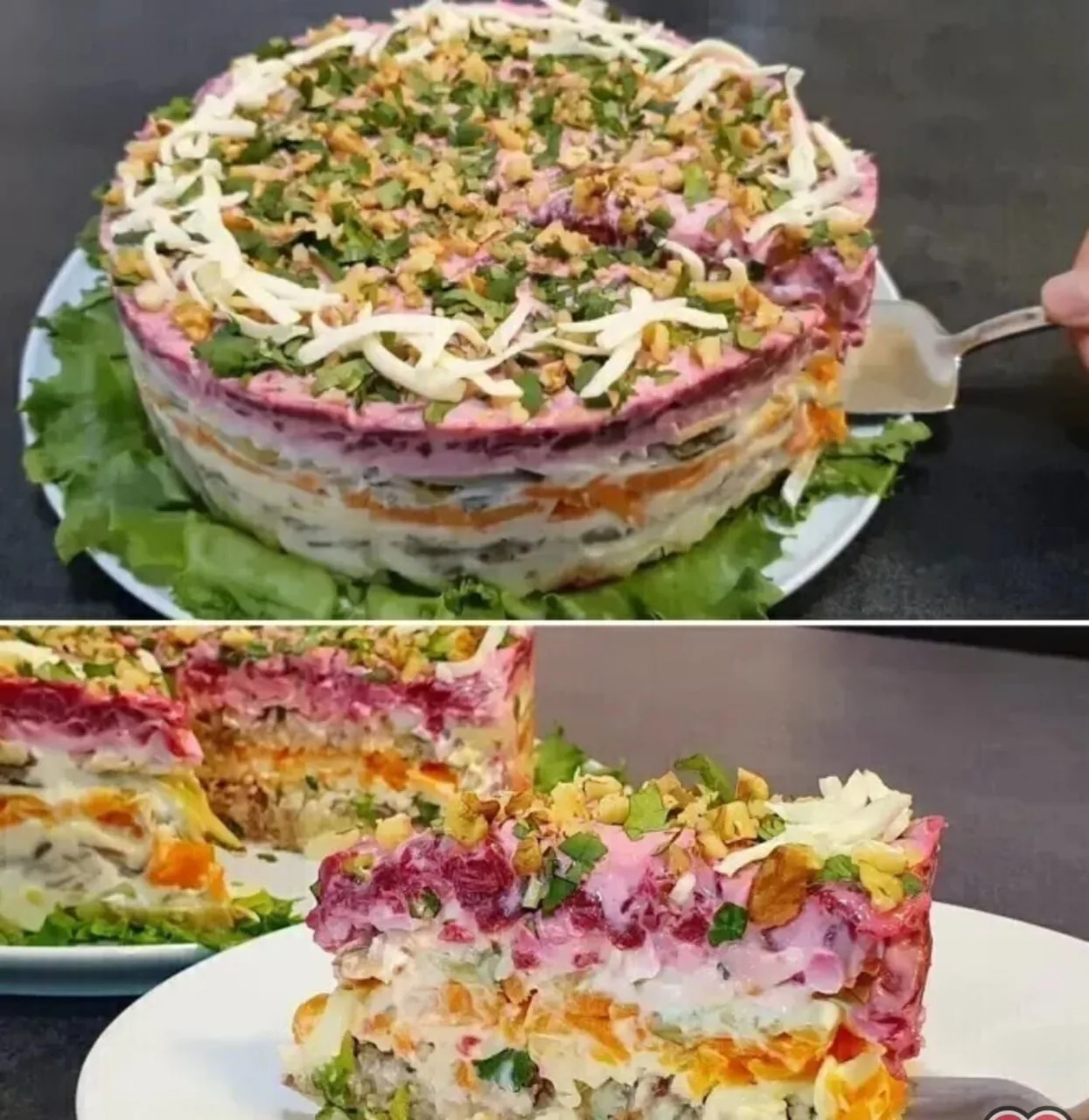 Чтобы салат держал форму как на картинке, слегка утрамбовывай каждый слой ложкой и используй кольцо или форму — тогда при подаче он будет выглядеть аккуратно и «дорого».