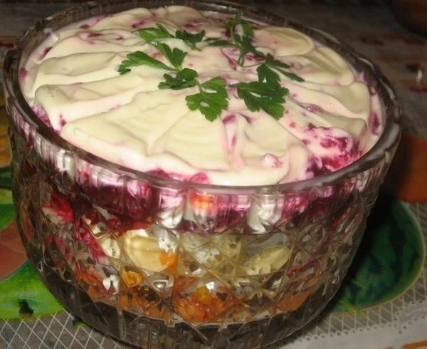 5⃣ Выложить слоями: картофель → говядина → сыр → морковь → огурцы → яйца → свёкла