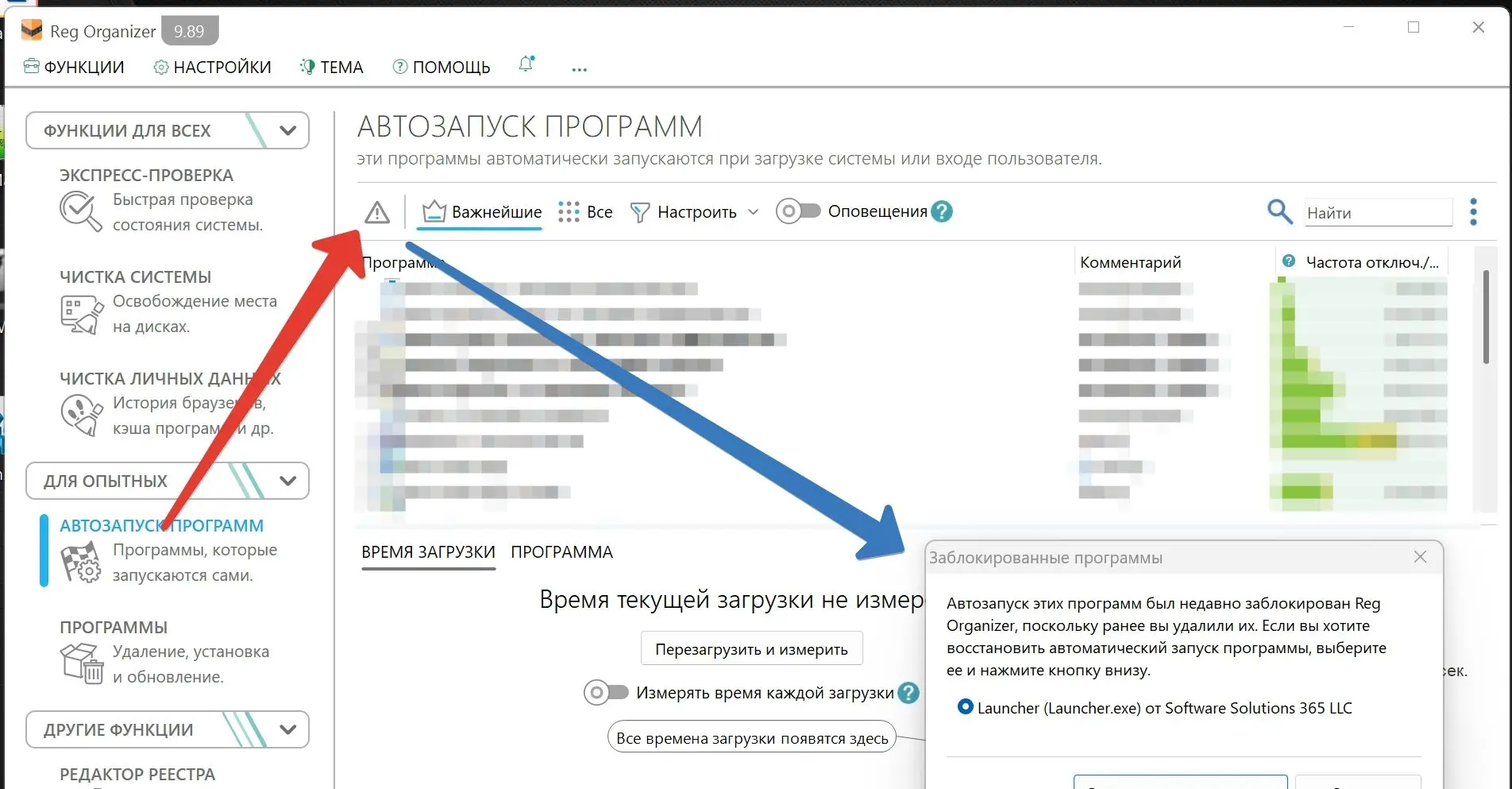 Ответ: Да, можно. Если Reg Organizer предотвратил попытку программы снова добавить себя в автозапуск (после того как вы запретили это с помощью указанной команды), на панели инструментов появится специальная кнопка (см. скриншот). С её помощью вы можете посмотреть список всех заблокированных программ и при необходимости разблокировать их.