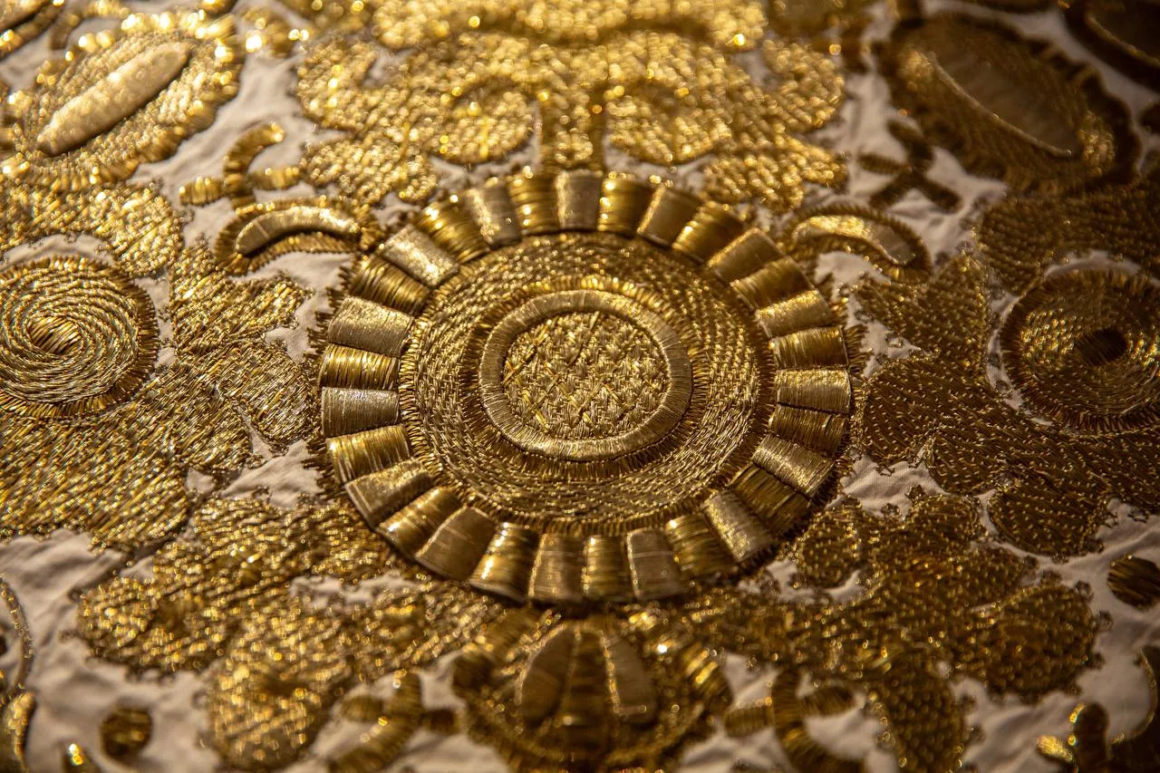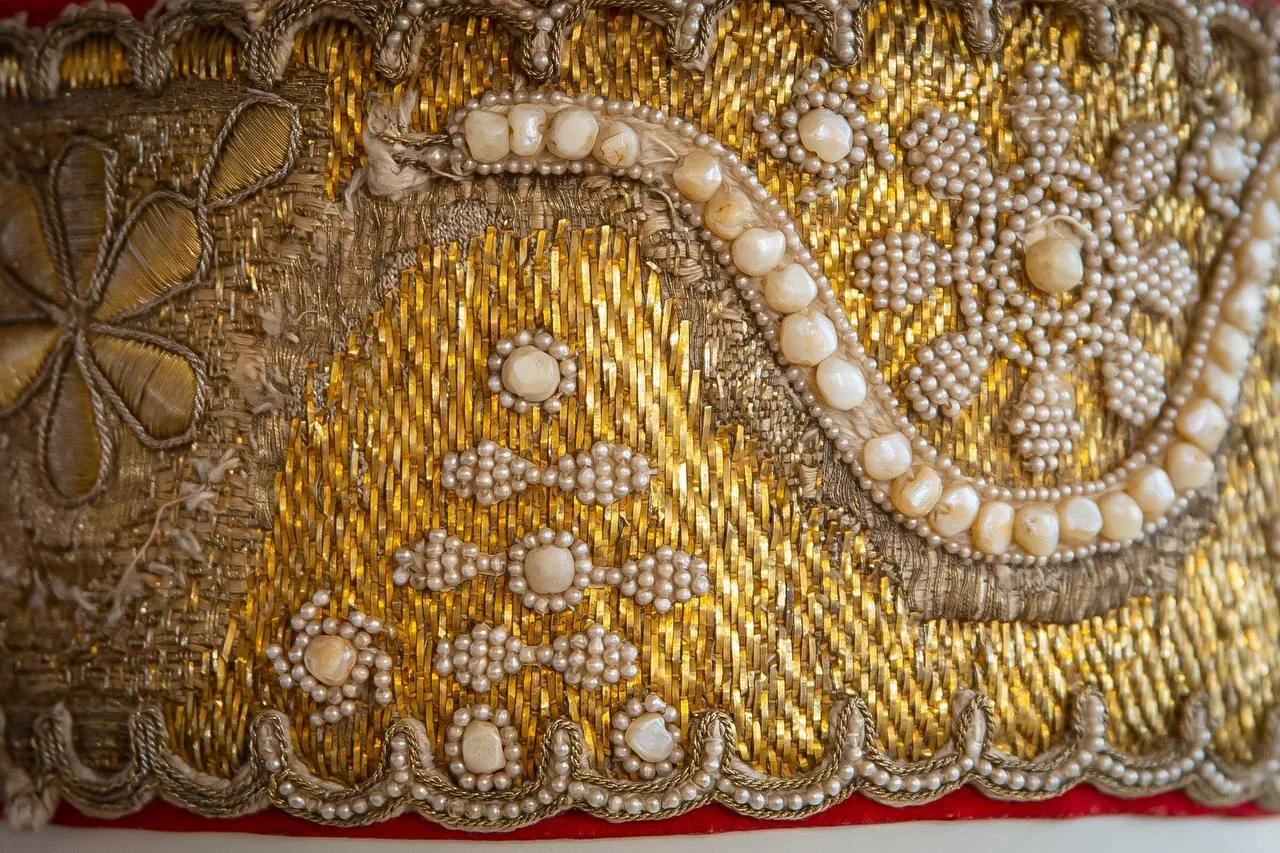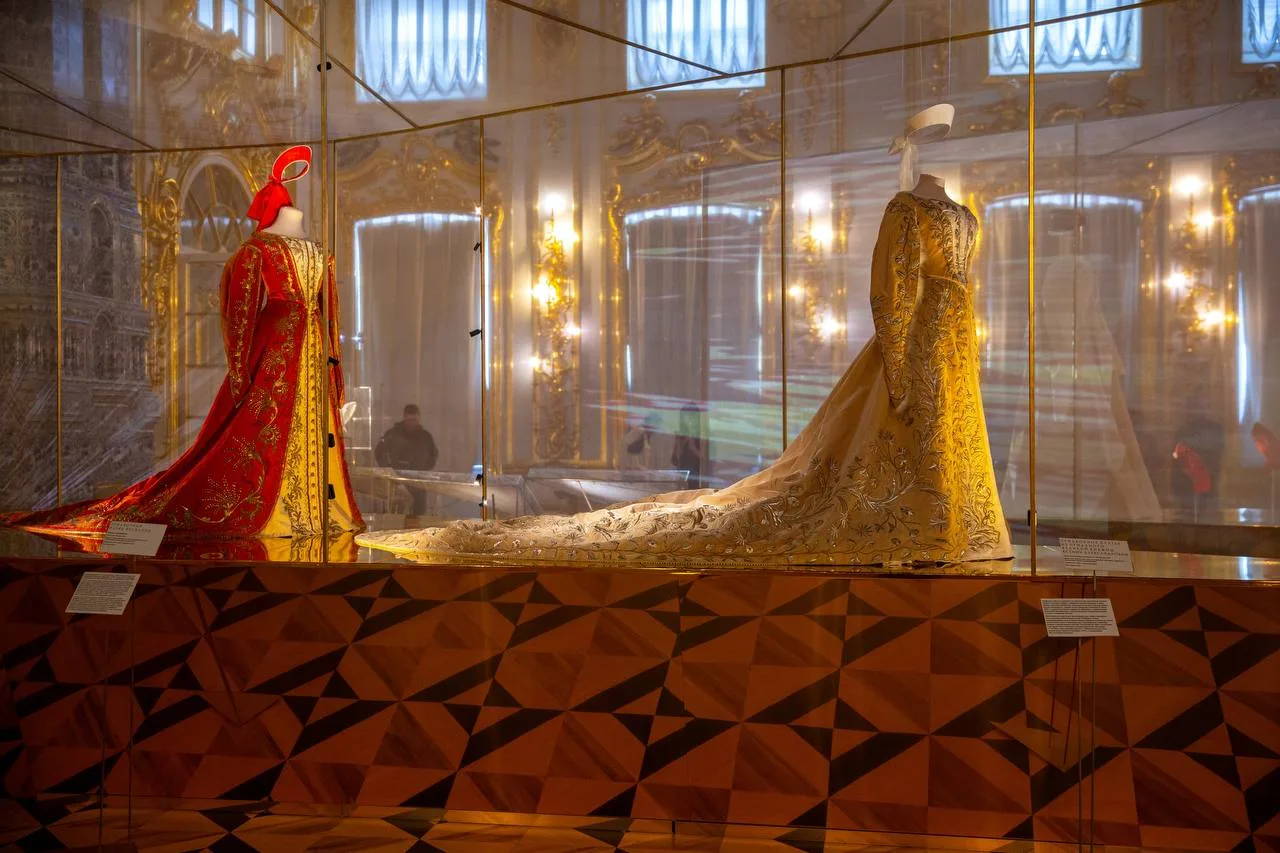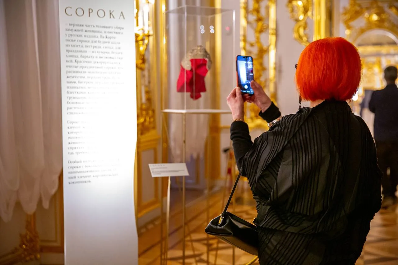 В экспозиции представлено 60 музейных предметов: расшитые одежды представителей императорского двора из коллекции музея-заповедника, каргопольские кокошники, перевязки, платки, сороки с речным жемчугом и тончайшей вышивкой.