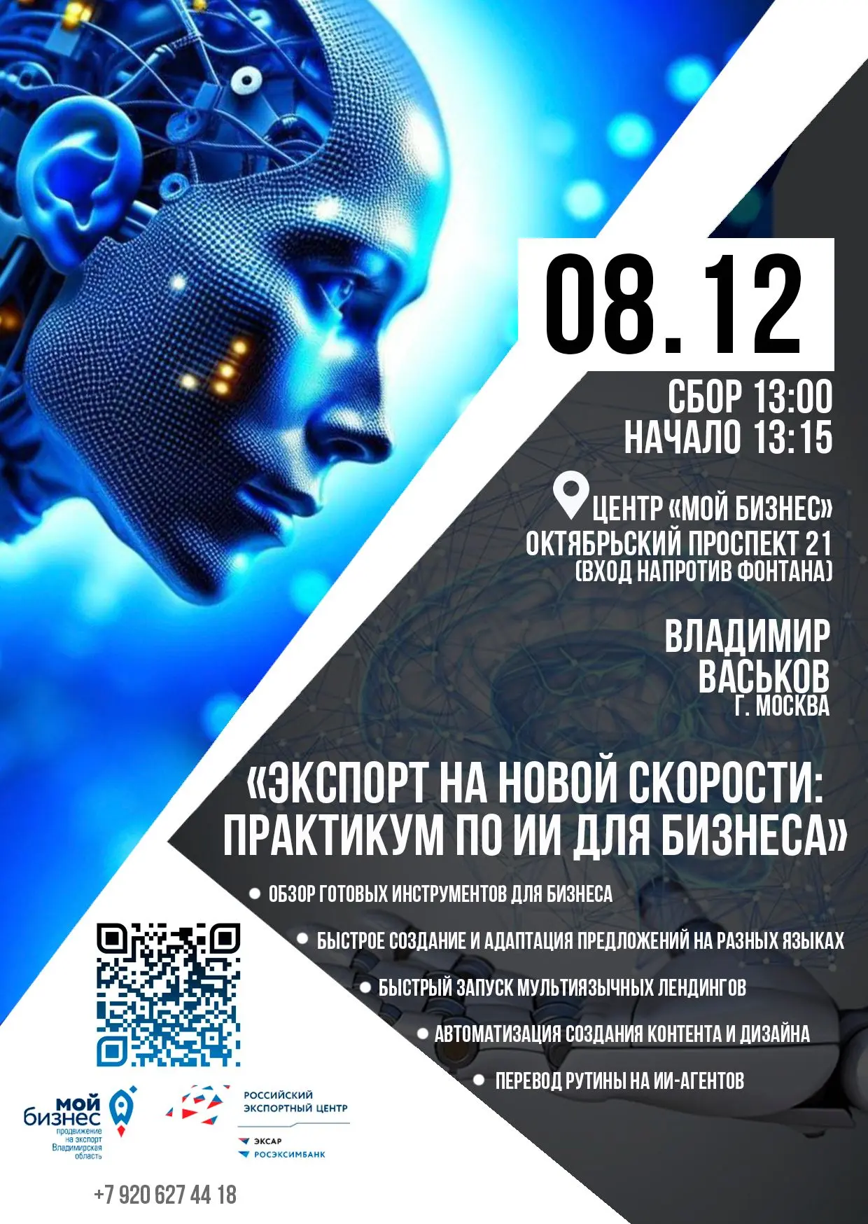 Центр поддержки экспорта Владимирской области приглашает предпринимателей на эксклюзивный практикум «Экспорт на новой скорости: Практикум по ИИ для бизнеса». Это практическая сессия, где можно будет узнать, как искусственный интеллект уже сегодня может стать вашим самым эффективным и неутомимым сотрудником.