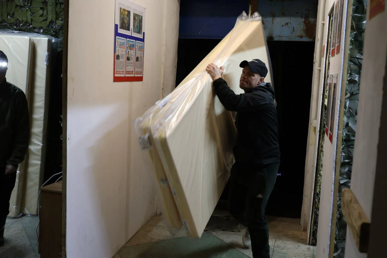Ночью колонна гумконвоя Правительства Владимирской области добралась до места дислокации одного из подшефных медбатов на Луганском направлении. Груз - особенный. Сюда доставлены новые удобные матрасы и подушки для раненных, проходящих лечение в госпитале.