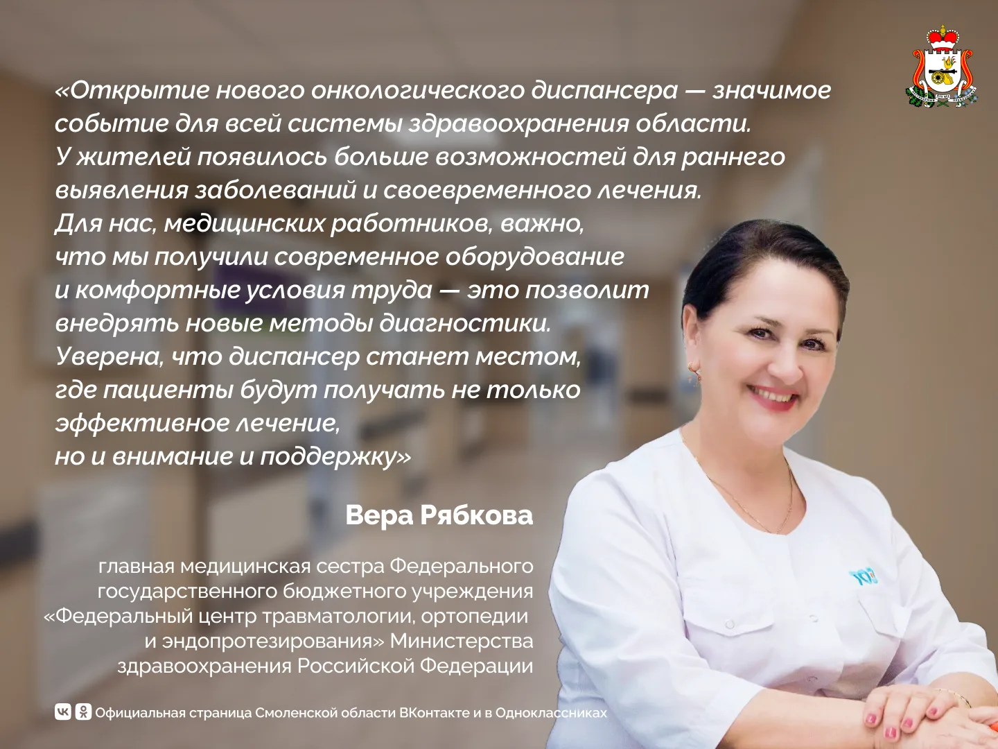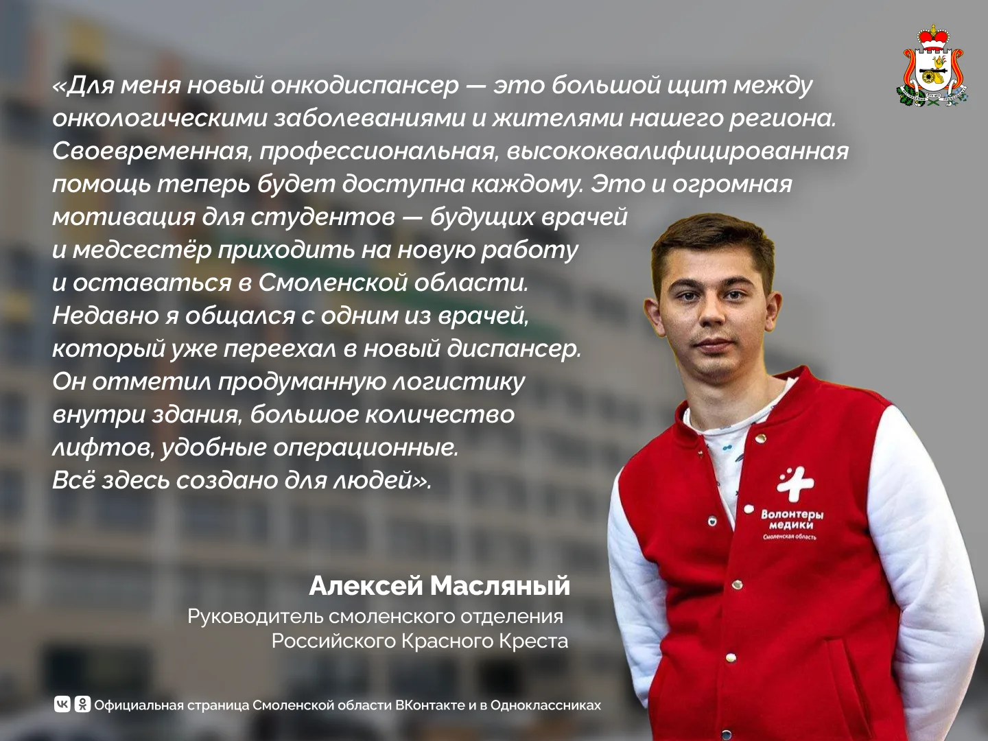 «Для меня новый онкодиспансер — это большой щит между онкологическими заболеваниями и жителями нашего региона. Своевременная, профессиональная, высококвалифицированная помощь теперь будет доступна каждому. Это и огромная мотивация для студентов — будущих врачей и медсестёр приходить на новую работу и оставаться в Смоленской области. Недавно я общался с одним из врачей, который уже переехал в новый диспансер. Он отметил продуманную логистику внутри здания, большое количество лифтов, удобные операционные. Всё здесь создано для людей»