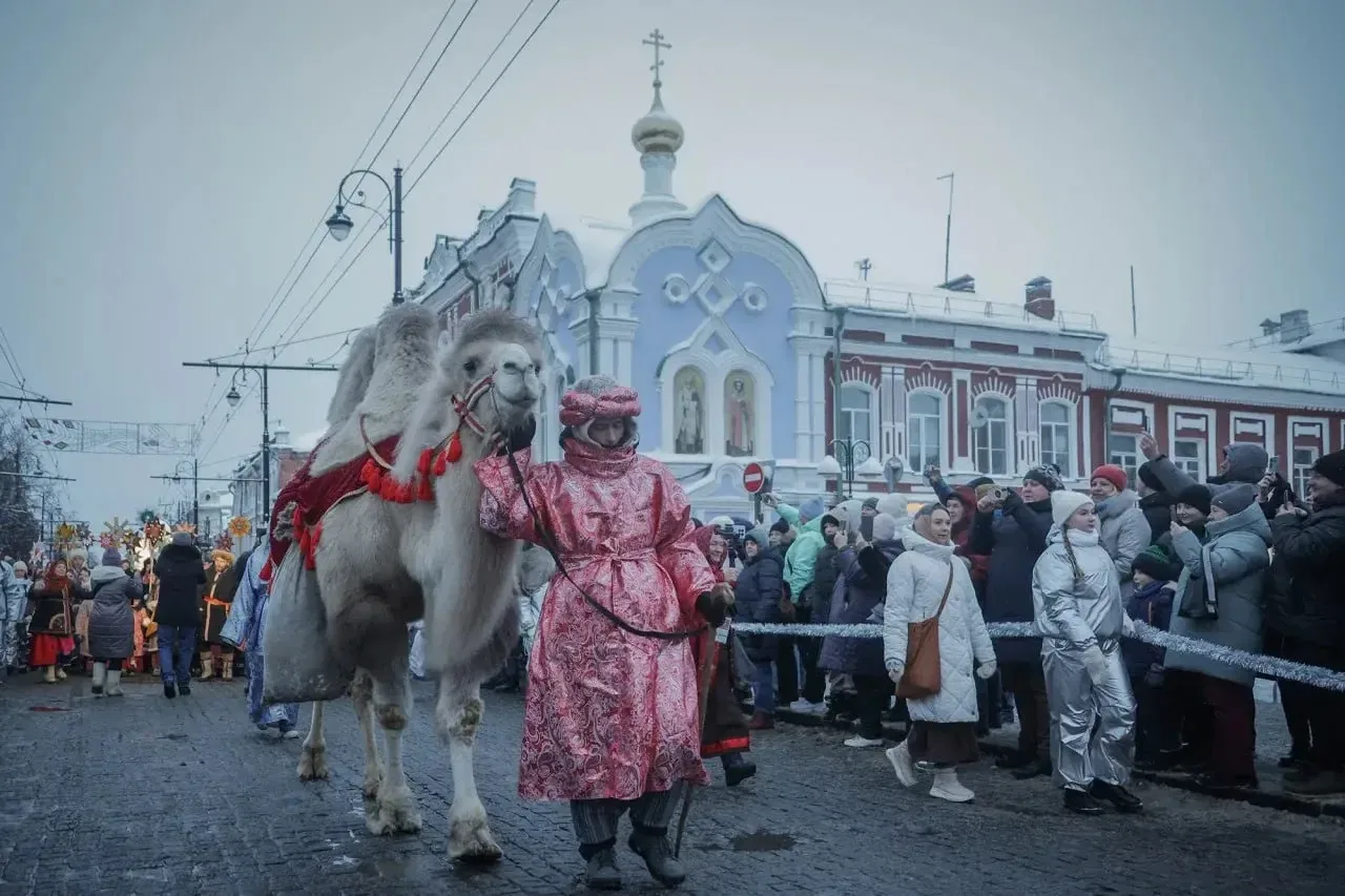 Сотни участников и гости встретились на Крестовой, где колонну возглавили волхвы с высоким верблюдом — отсылка к континентальному пути мудрецов.