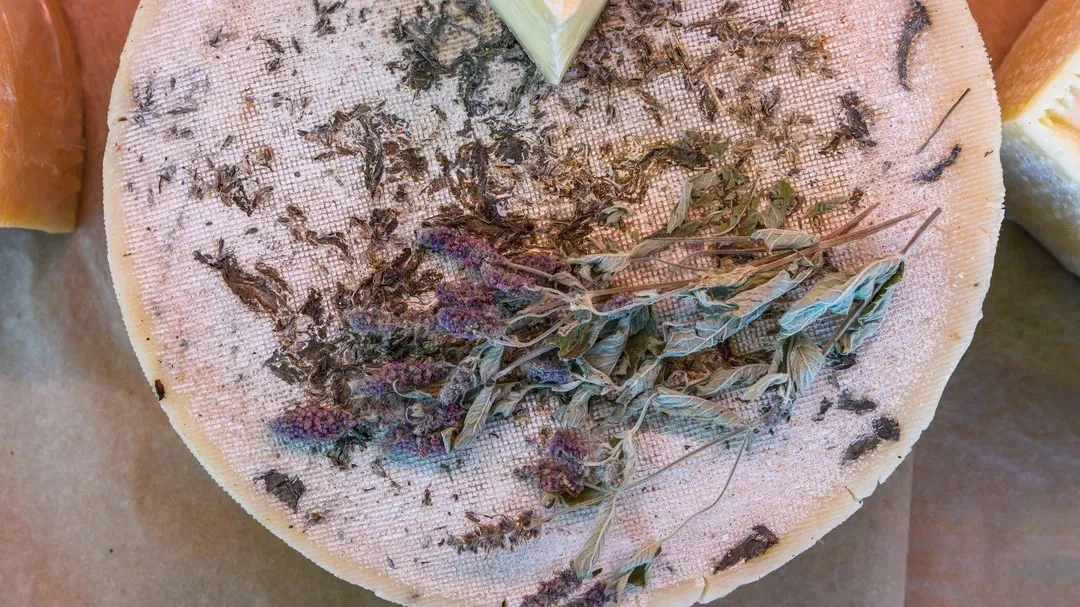 Блины с копченой хурмой и сулугуни: тут сладость фрукта, дымные нотки и солоноватый сыр. Подают со съедобными фиалками.