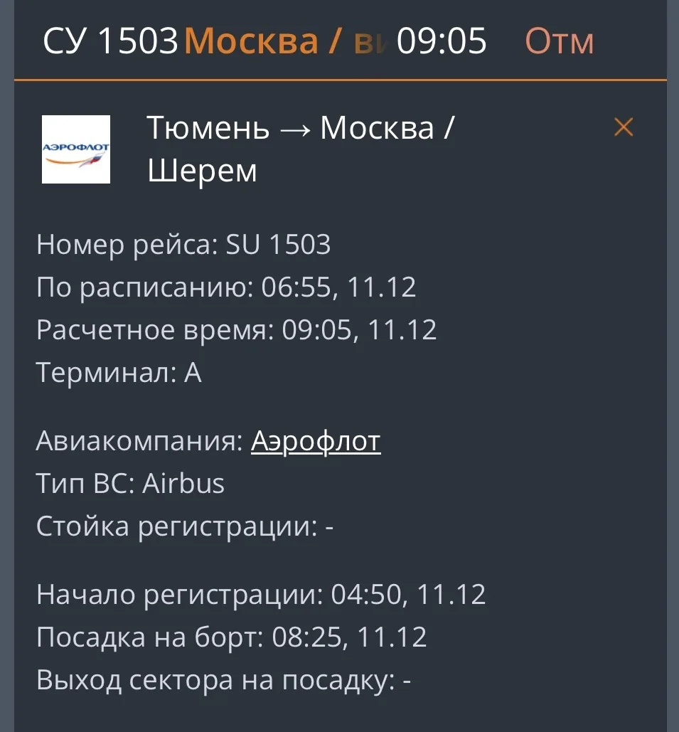 Авиарейс SU1503, следующий из Тюмени в Москву, был отменен после более чем суточного ожидания пассажирами. Первоначальное время вылета на 11 декабря неоднократно корректировалось (с 08:00 до 09:05, затем до 20:00), прежде чем было объявлено об отмене.
